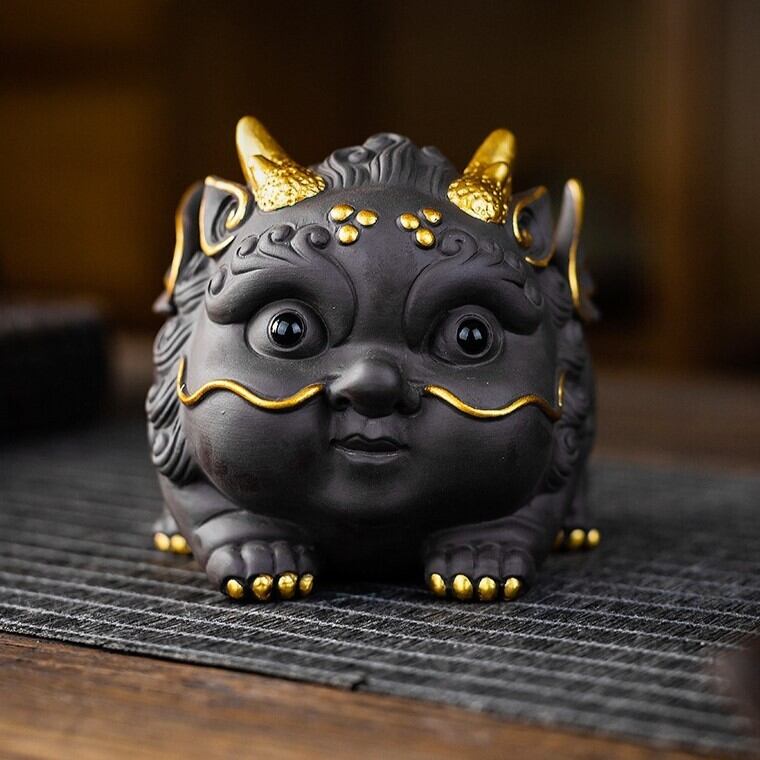中国古来の神獣である貔貅をモチーフにした精巧な置物です。貔貅は財運を引き寄せ、悪い気を退けると信じられ、特に富や繁栄を願う人々に愛されています。独特の愛らしいフォルムと紫砂(しさ)特有の深みのある質感が組み合わさり、伝統とモダンが調和した逸品となっています。