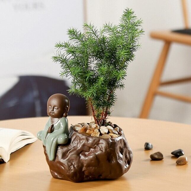 手作り感のある丁寧な造りが魅力的なこのセラミック鉢植えは、インテリアとしても優れたアクセントになります。デスクやリビング、玄関など、どんな空間にも温かみを与えます。また、植物の緑と僧侶の柔らかなデザインが絶妙に調和し、癒しと活力を同時に感じられる一品です。