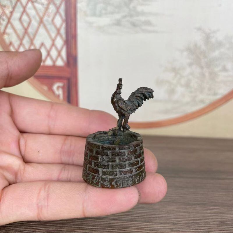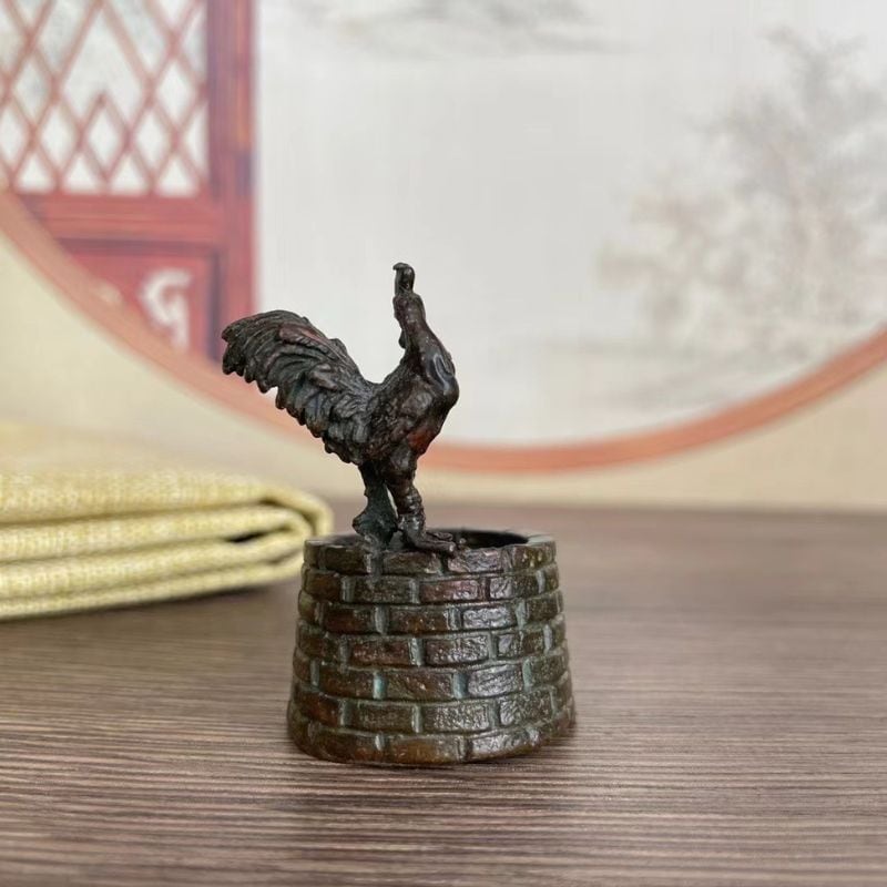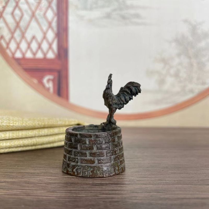 古くから縁起物として親しまれてきた「金鶏独立」をモチーフにした、アンティーク調の合金製置物です。細部まで丁寧に施された彫刻と、重厚感のある銅風仕上げが、まるで古美術品のような趣を漂わせます。