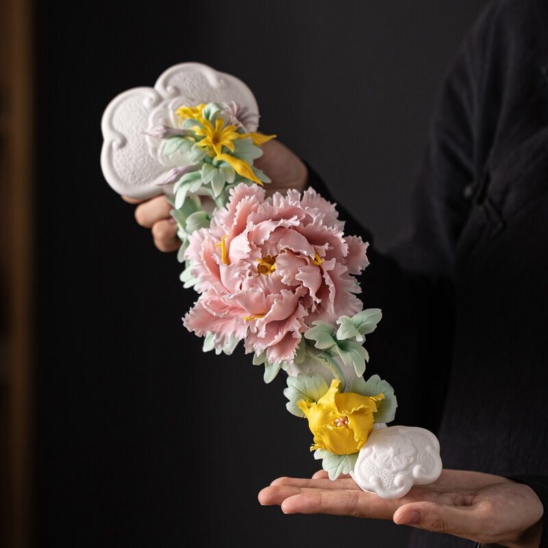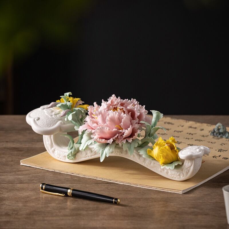 風水では、牡丹のモチーフは愛情運や家庭運を高めると信じられています。特に、ピンクは優しさや恋愛の調和を、イエローは明るさと財運を引き寄せるカラーとして重視されています。このオブジェを飾ることで、心の安らぎと運気の向上を願う方にとって心強い存在となるかもしれません。