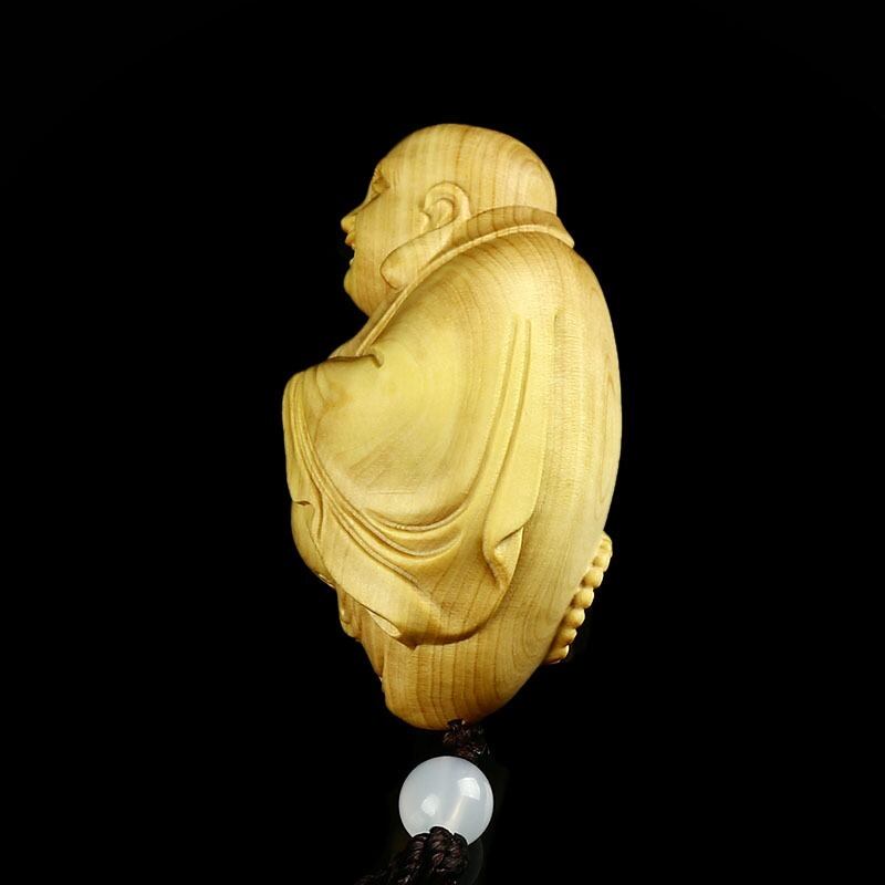 福を招く神として親しまれている布袋様を象った木製のペンダントです。布袋様は、長い間、富や幸福を象徴する存在として広く信仰されています。彼は、笑顔と共に大きな袋を背負い、そこから無限の富と幸運を分け与えると言われ、商売繁盛や家庭の幸せを願う人々にとって非常に尊ばれています。