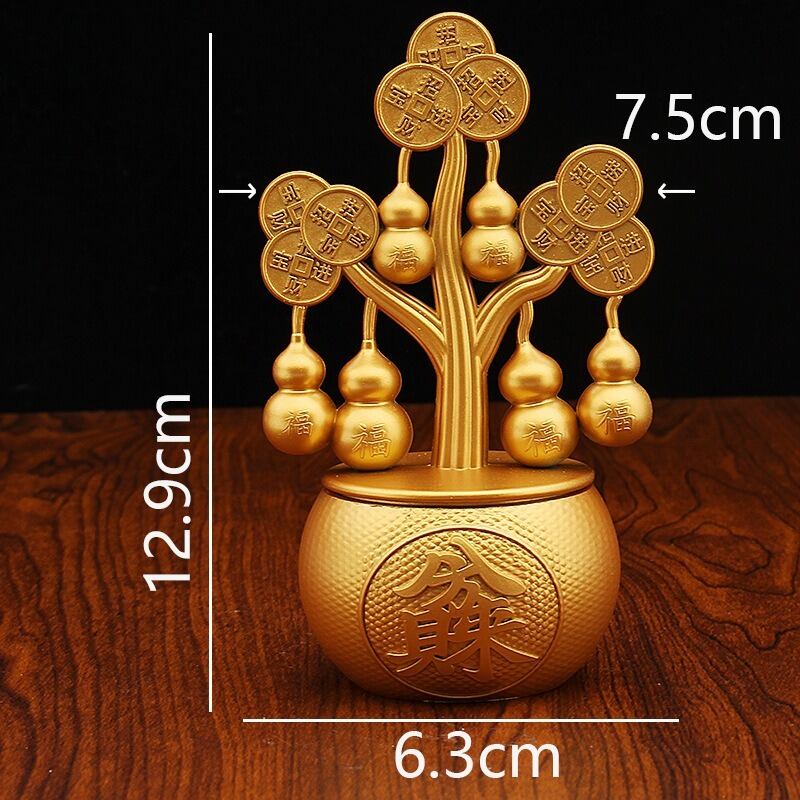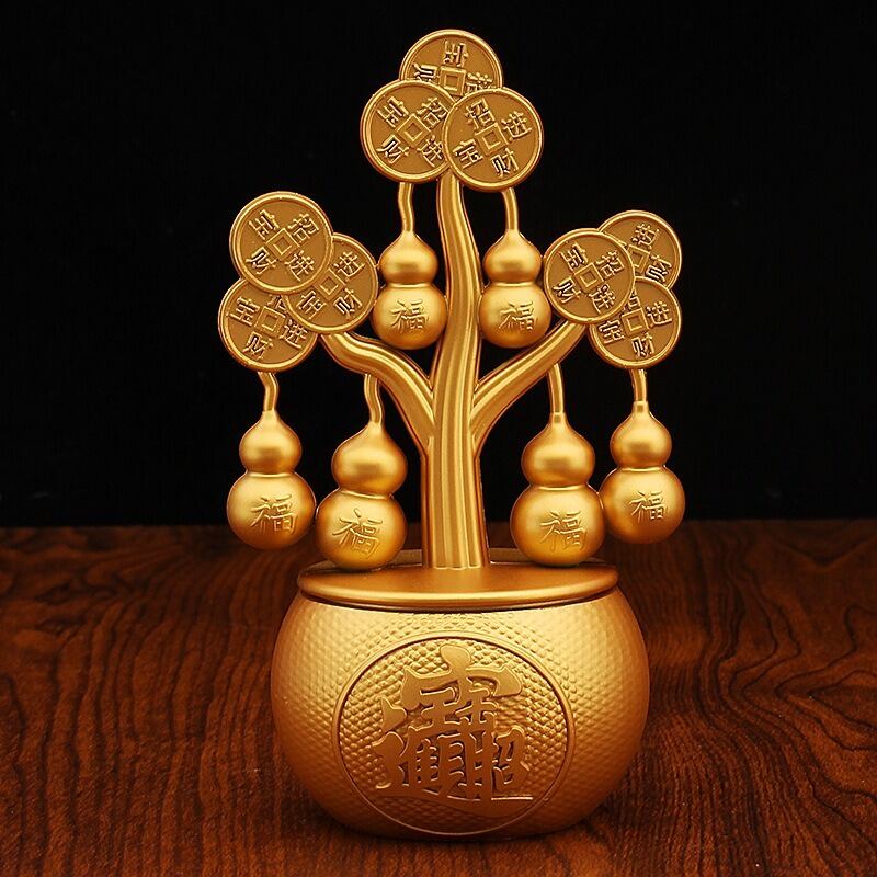 この置物は、精巧に作り込まれた金色の木と瓢箪が特徴で、見るたびにポジティブなエネルギーを感じさせてくれることでしょう。家庭やオフィスのインテリアとして飾ることで、空間に華やかさを加え、運気向上をサポートする存在となるかもしれません。また、このオブジェは贈り物にも最適で、幸運を願う大切な人への心温まる贈り物としても喜ばれることでしょう。