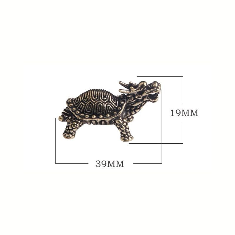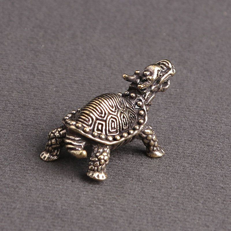 本品は黄銅で精巧に鋳造され、アンティーク調に仕上げられた龍龜の小像。ずっしりとした質感と繊細な造形が魅力で、机上やリビングの飾り物としてはもちろん、茶寵(茶席の縁起飾り)としてもおすすめです。また、キーリングや吊り飾りとしても使えるため、車やバッグに付けて身近な守護とすることも可能です。