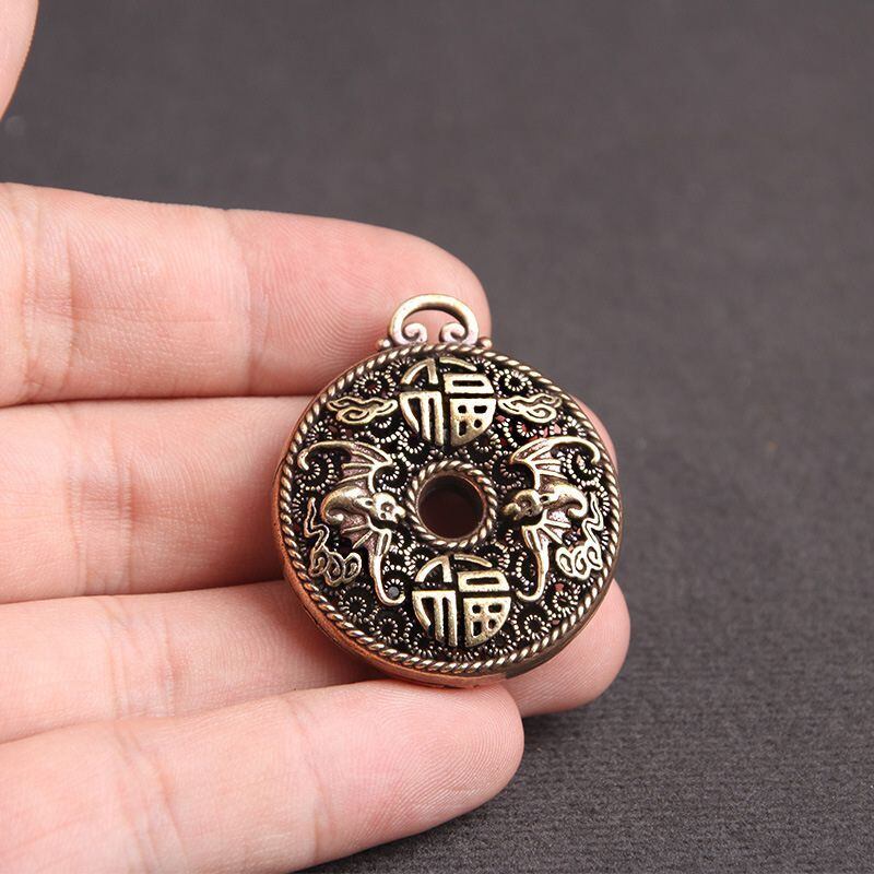 古来より「五福臨門」とは、長寿・富貴・康寧(健康と平安)・好徳(徳を積むこと)・善終(安らかな人生の終わり)という五つの幸福が門を訪れることを意味し、最も縁起の良い言葉のひとつとされてきました。こちらのアイテムは、黄銅を用いて精巧に仕上げられた円形の吊り下げ飾りで、中央に穴を配し、周囲に「福」の文字を刻むことで、気の流れを整えつつ福を呼び込むデザインになっています。