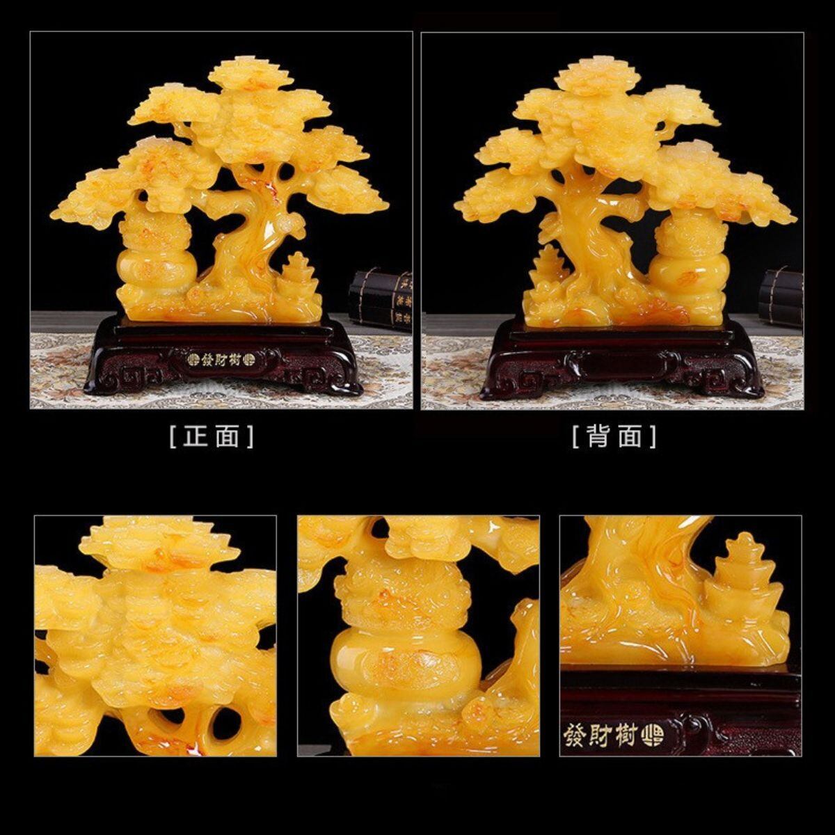 本品は樹脂を用いて翡翠や琥珀のような質感に仕上げられており、艶やかな黄金色が空間を明るく照らします。幹は力強さを、枝葉は繁栄を表し、樹下には宝袋や金塊が表現されており、財を集めて増やすという吉祥の意味が込められています。