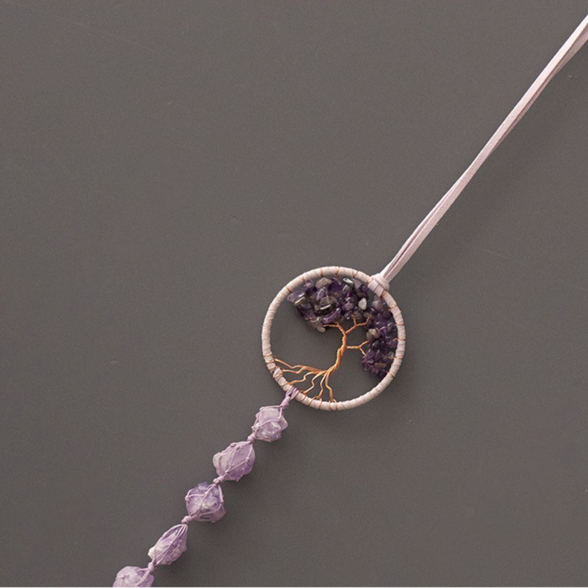 美しい紫の輝きを放つ天然アメジストを使用した「生命の樹 吊り飾り」は、自然の力とアートを融合させた癒しのアイテムです。丁寧にハンドメイドで編み込まれた生命の樹モチーフは「成長」「繁栄」「永続的な幸運」を象徴し、持つ人に安定と調和をもたらすといわれています。