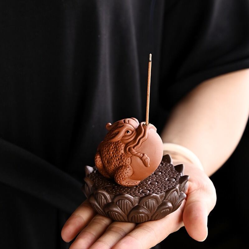 ユニークなデザインと縁起の良さを兼ね備えたお香立てです。蛙は、東洋文化において金運や幸運を象徴する存在として親しまれてきました。その名が「帰る」と同音であることから、富や運気が「戻る」と信じられ、商売繁盛や金運アップのお守りとして多くの人々に愛されています。