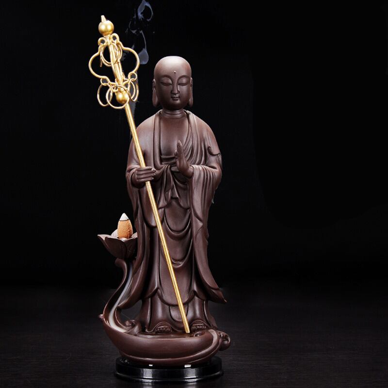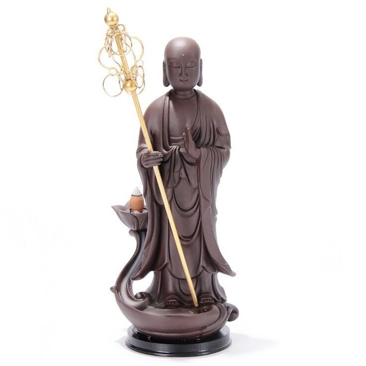 仏教において深い慈悲と守護を象徴する地蔵菩薩を表現した美しいオブジェです。地蔵菩薩は、特に亡くなった人々の魂を守り、苦しみを取り除く存在として信仰されてきました。また、子どもや旅行者、困難に直面している人々に対しても、守護の力を発揮するとされ、多くの人々から深い敬愛を受けています。この地蔵の置物は、紫砂という伝統的な陶芸素材を使用しており、温かみのある色合いと落ち着いた雰囲気が特徴です。