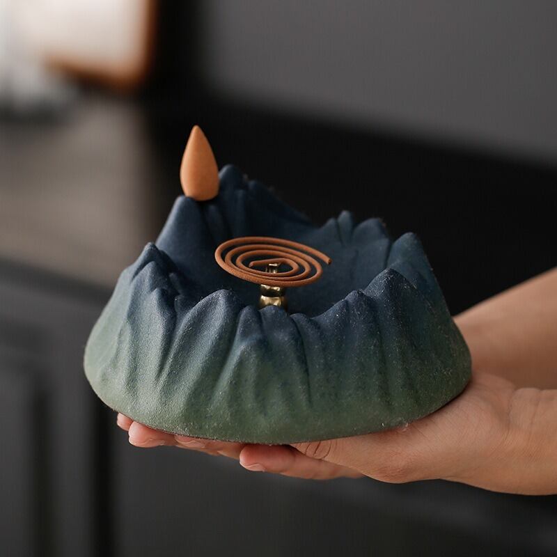 和モダンの美しさを纏った逆流香炉、「山」をモチーフにした水色のデザインが特徴的な逸品です。この香炉は、逆流する煙が滝のように流れる姿を演出し、視覚的にも心地よい癒しをもたらします。