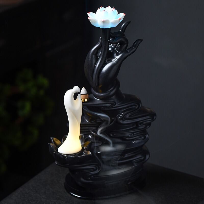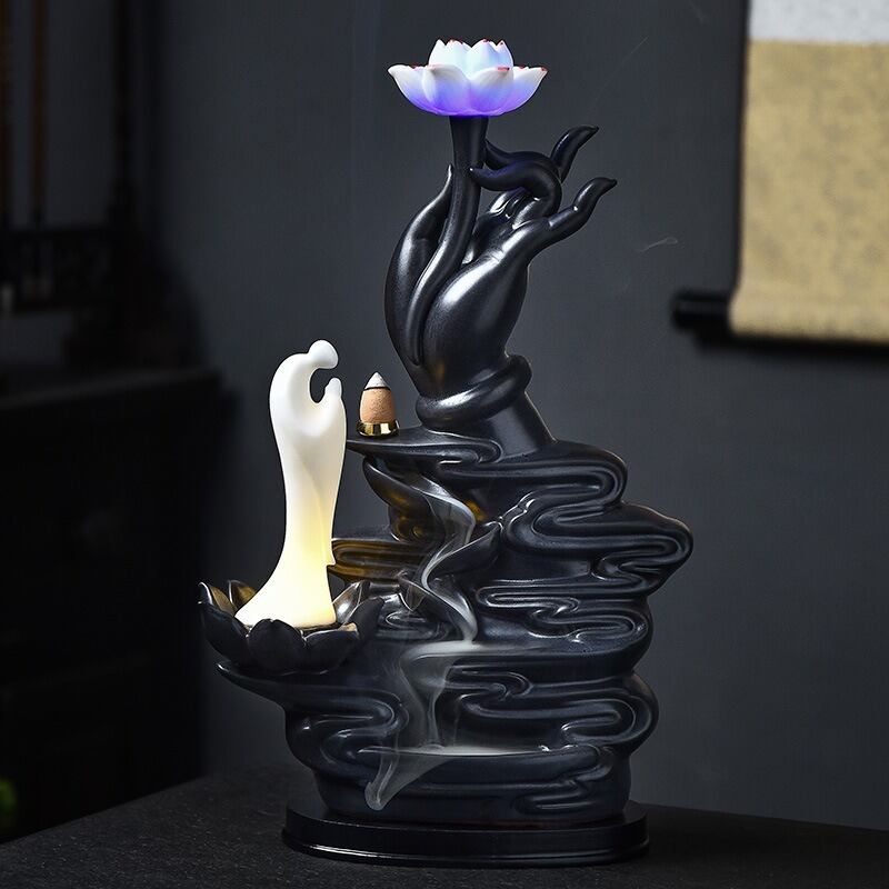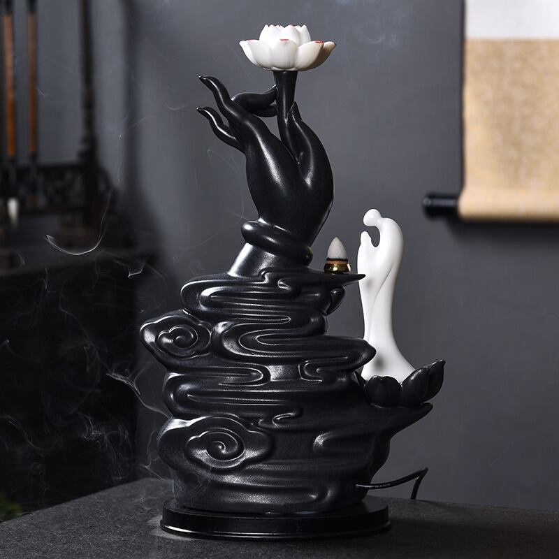 逆流香炉特有の煙が滝のように流れるデザインは、視覚的に美しいだけでなく、運気を浄化し、心の安定を促すとされています。特に、この香炉に描かれた「神の手」は、困難を取り除き、新たな道を開く象徴として信仰されており、日常生活にポジティブな影響をもたらすかもしれません。
