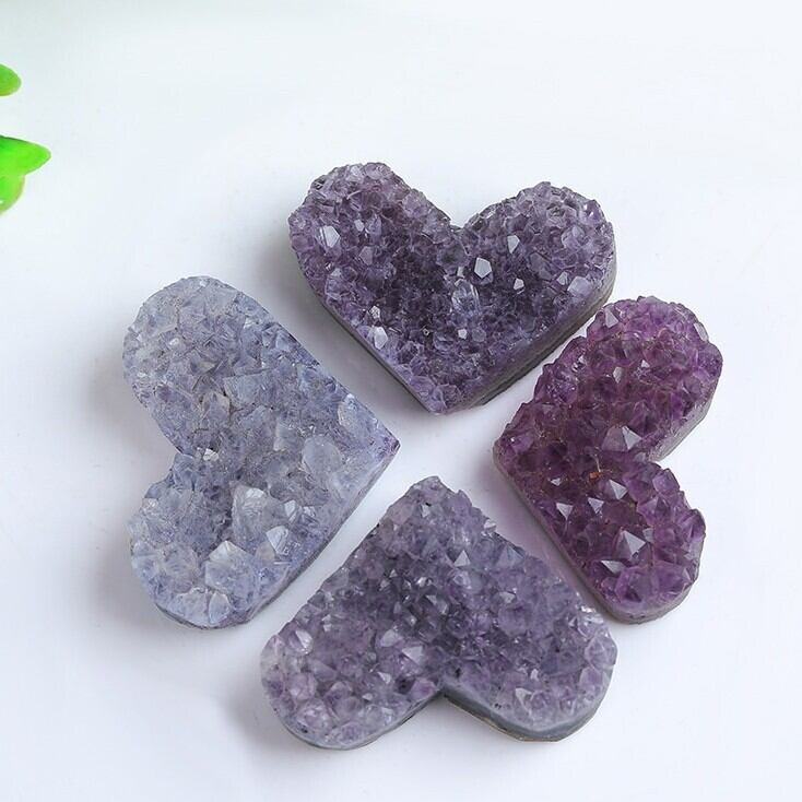 美しいアメジストを使用したクラスター型のオブジェで、愛と癒しを象徴するハート型デザインが特徴です。アメジストは古くから、精神的な安定をもたらす石として、また心の浄化を促す力を持つと信じられてきました。特にこのハート型のクラスターは、恋愛や人間関係の調和を図るためのアイテムとして、人気があります。