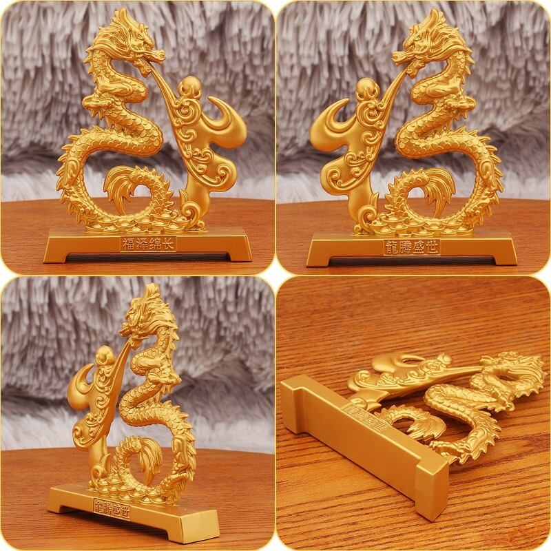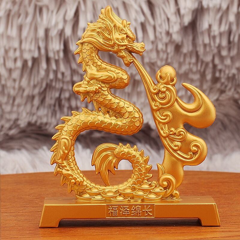 このオブジェのドラゴンは火を噴く姿で描かれており、困難や障害を焼き払う力を象徴しています。その燃え盛る炎は、情熱や活力を表し、新たな道を切り開く勇気をもたらす存在とされています。金色のデザインがさらにその縁起の良さを引き立て、富と繁栄の象徴としての魅力を高めています。