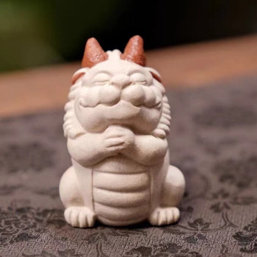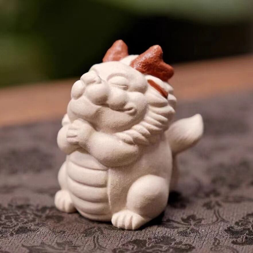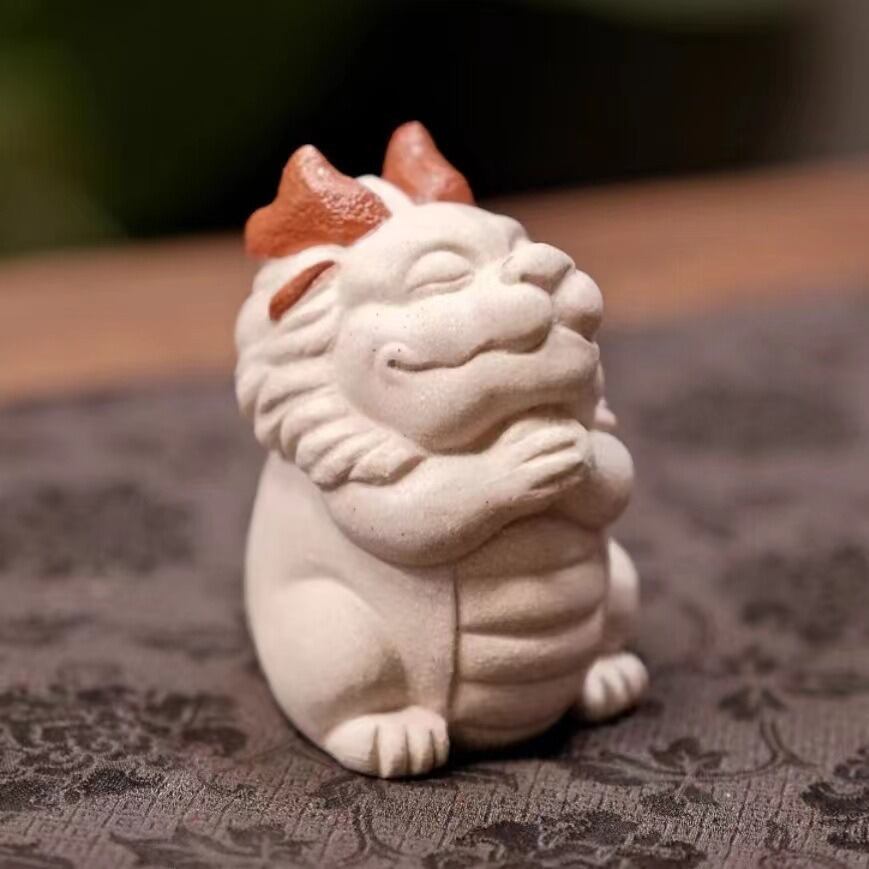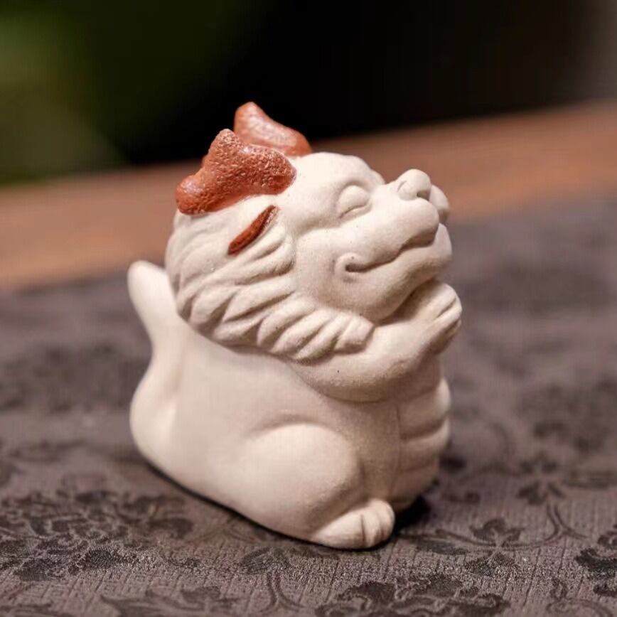 このホワイトドラゴンは、祈るような姿勢をとっており、その姿勢には「願いを込める」「希望を叶える」という意味が込められています。白色は浄化と新しい始まりを象徴し、ポジティブなエネルギーを引き寄せ、周囲の環境を整えると言われています。紫砂の素材は、手作りならではの温かみと深みがあり、どこに飾っても空間に心地よい落ち着きを与えてくれるアイテムです。