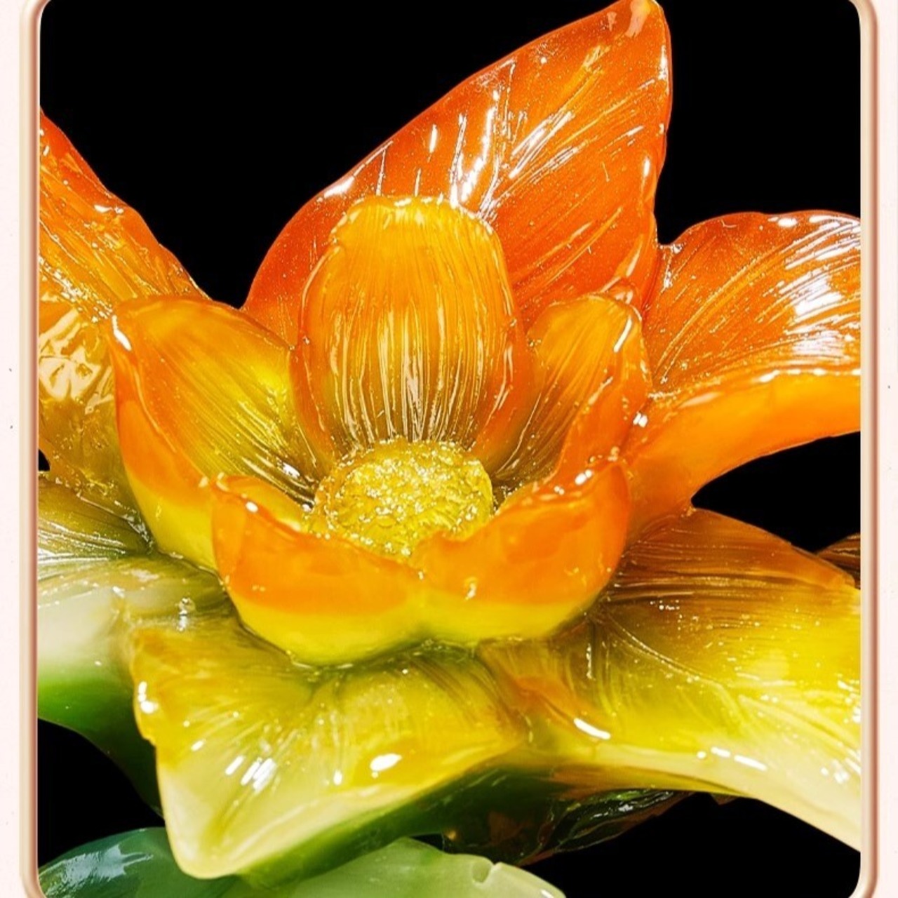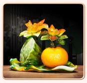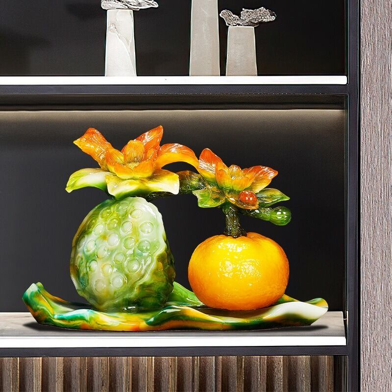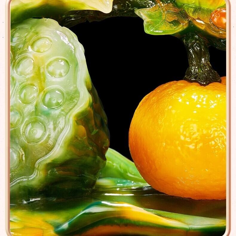 蓮の実とオレンジの果実を組み合わせたこの置物は、豊かさと調和を象徴する縁起の良いデザインが特徴です。蓮は古来より「浄化」や「精神的な成長」を象徴するとされ、蓮の実は特に「繁栄」と「家族の幸福」を表すと信じられてきました。一方、オレンジの果実は、鮮やかな色と形状から「幸運」や「成功」を引き寄せるとされています。