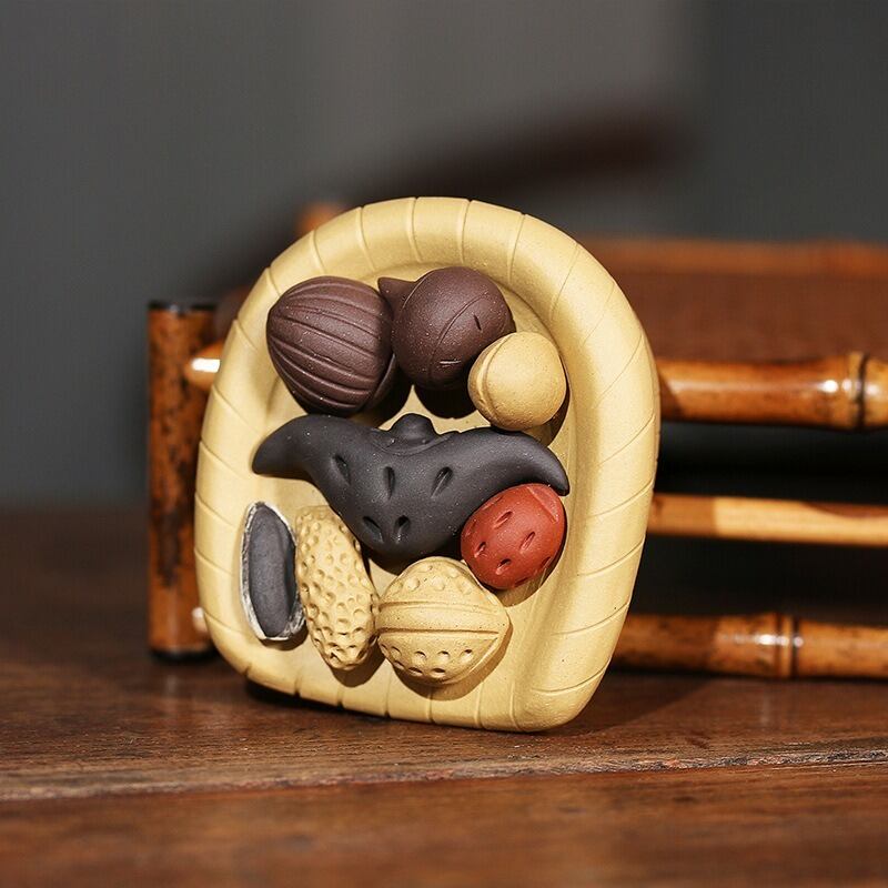 紫砂の素材が持つ質感は、品位を感じさせ、空間に落ち着きと豊かなエネルギーをもたらします。風水的にも、ナッツの形状が呼び込む繁栄のエネルギーは、インテリアとしての美しさを保ちながら、生活にポジティブな影響を与えるとされています。