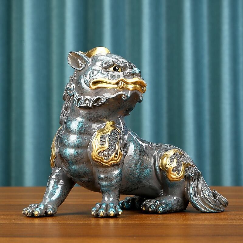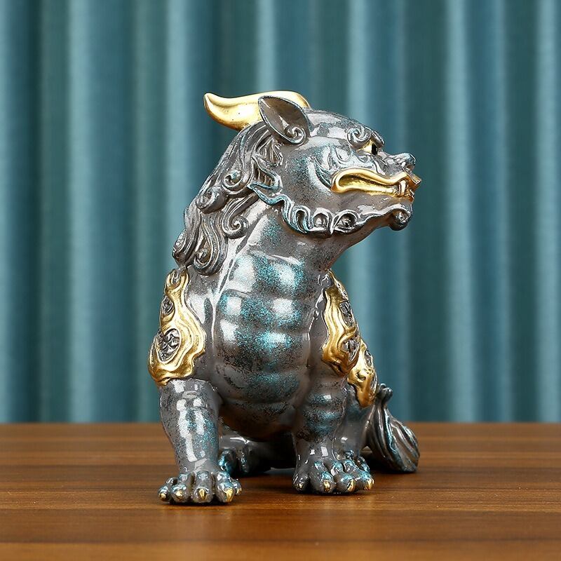 精緻な銅製で作られ、グレーの落ち着いた色合いに金色の差し色が施されており、シックで高級感あふれるデザインです。獅子は古代から「王者の象徴」として信じられ、強さ、勇気、守護のシンボルとして崇められてきました。特に風水においては、家庭やビジネスにおける守護神として、その存在が安定や繁栄をもたらすとされています。
