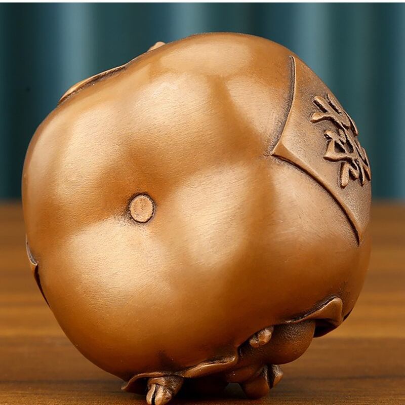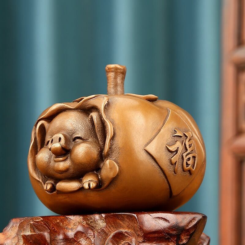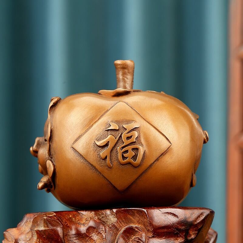 柿に愛らしい豚の顔があしらわれた、ユニークな銅製の置物です。このオブジェは、見る人を思わず笑顔にさせる遊び心溢れるデザインでありながら、風水やスピリチュアルの視点からも興味深い意味を持っています。