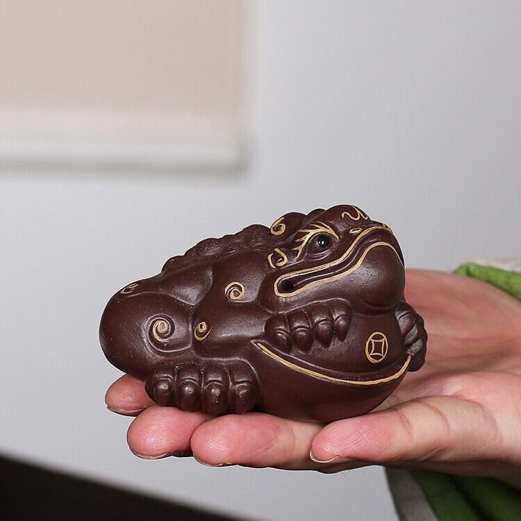 この置物は、風水においても重要な役割を果たします。蛙の足元にコインをくわえたデザインは、金運を呼び寄せると信じられ、生活空間に置くことで、ポジティブなエネルギーを集め、運気を向上させる助けとなるかもしれません。紫砂で作られたこの蛙は、自然の温かみと落ち着いた色合いが特徴で、インテリアとしても洗練された美しさを放ちます。