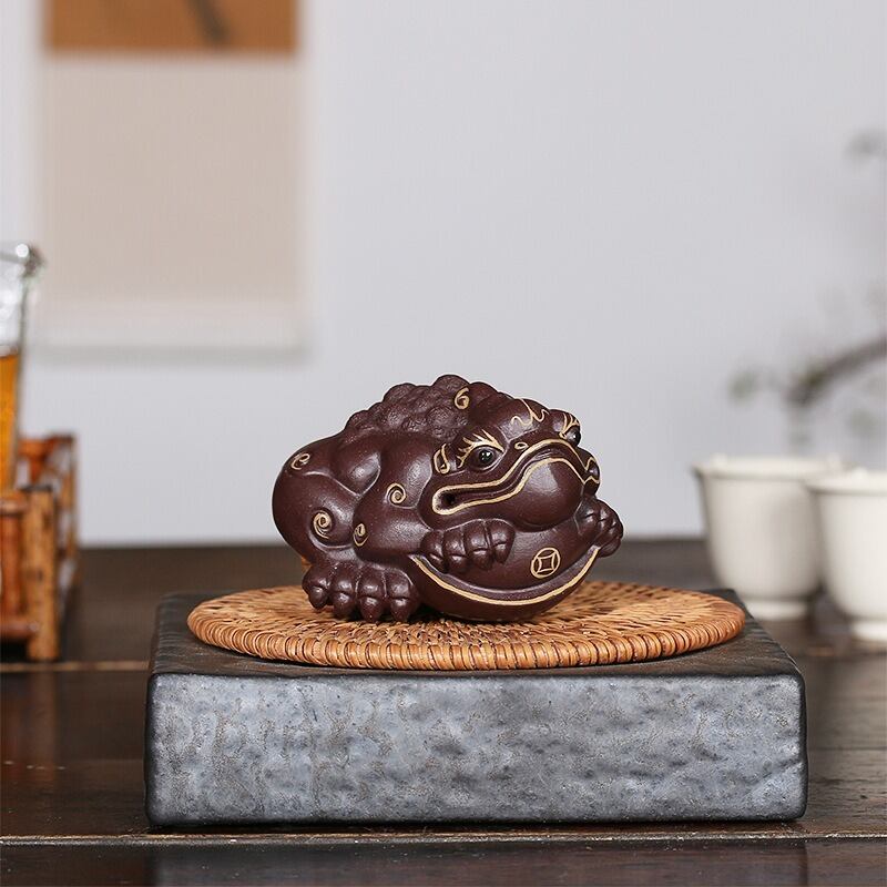伝統的な信仰に基づき、蛙はまた、家庭の安全や幸福も守る存在とされています。このオブジェを飾ることで、豊かさを呼び込むだけでなく、家族の和や幸せを育む手助けとなるかもしれません。紫砂の温かい質感が、空間に穏やかで安定感をもたらし、見ているだけで心安らぐひとときを提供してくれるでしょう。