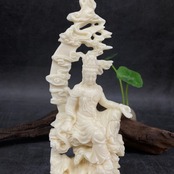 この「水月観音の置物」は、象牙果という美しい素材で精緻に彫刻された作品で、観音菩薩の優しさと包容力を感じさせるデザインが特徴です。象牙果はその質感が滑らかで温かみを感じさせ、観音菩薩の神聖さを引き立てます。また、このオブジェは、信仰的にも高い価値があり、飾ることで心を穏やかにし、運気を改善する助けになると言われています。