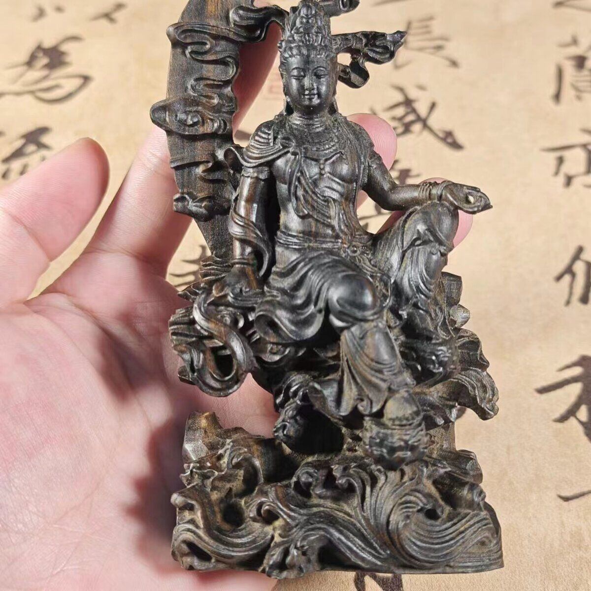 仏教における観音菩薩を象った美しいオブジェで、特に「水月観音」として知られる神聖な存在を表現しています。観音菩薩は、無限の慈悲と智慧をもって、信者の悩みや苦しみを癒し、導いてくれる存在として広く信仰されています。水月観音は、水面に映る月のように清らかな光を放ち、穏やかな平和と深い愛情を象徴しています。