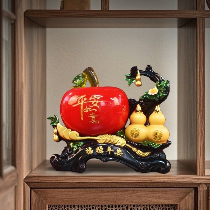 豊かな実りと繁栄を象徴する美しいオブジェです。林檎(りんご)は古来より「幸運」や「繁栄」を象徴し、特に風水では家庭内の幸福を呼び込む力を持つとされています。また、瓢箪(ひょうたん)は、財運や健康、そして邪気を払う守りのアイテムとしても古くから信仰されており、特に「福を呼び込む」として知られています。この二つのモチーフが一つになったオブジェは、非常に縁起が良いとされています。