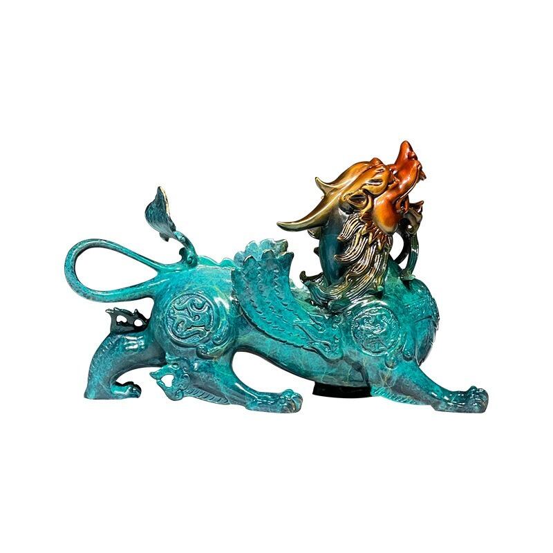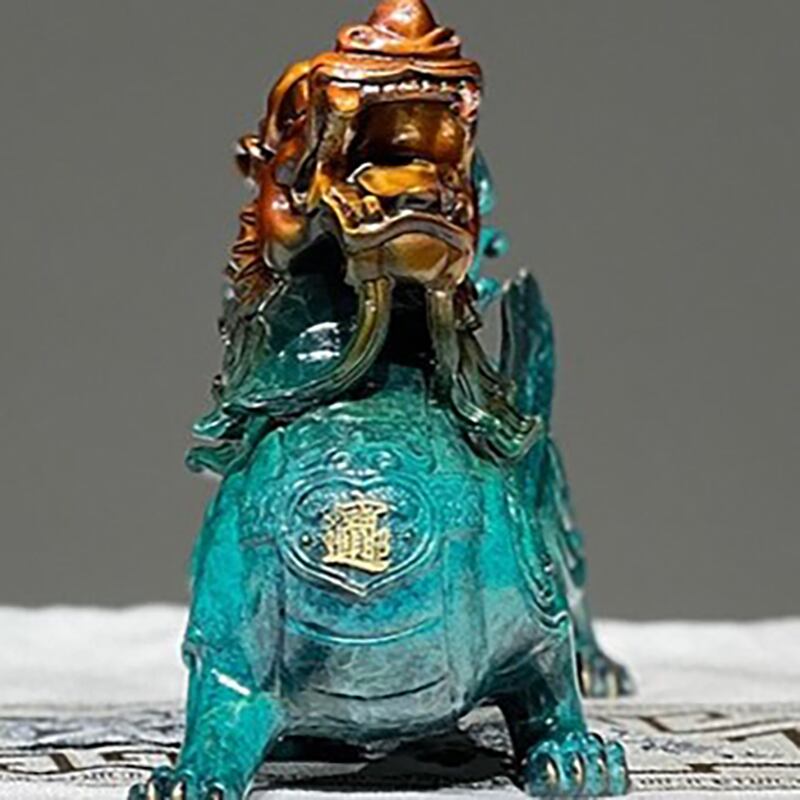 この貔貅の置物は、真鍮製で鮮やかなブルーの色合いが特徴で、強さと優雅さを兼ね備えたデザインです。真鍮という素材は古くからその耐久性と美しさで評価されており、この貔貅はその力強さと高級感を象徴するアイテムです。青い色は、風水においては「安定」を意味し、心の落ち着きや平和をもたらすとも言われています。