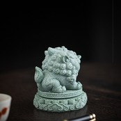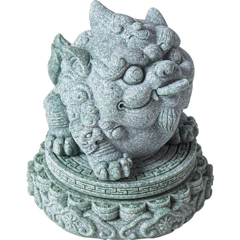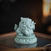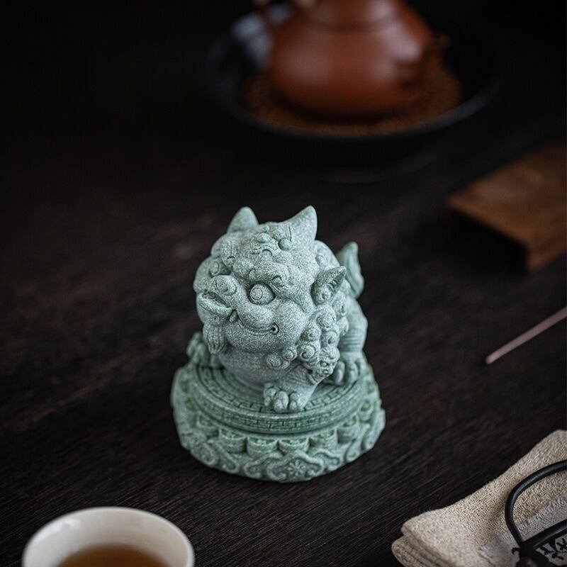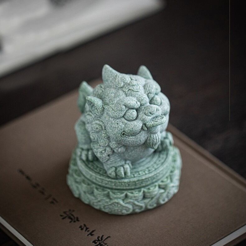 こちらの貔貅置物は、青砂石を使用した美しいデザインが特徴です。青砂石は、自然のエネルギーを調和させる力を持ち、周囲の空間に穏やかな力をもたらすと言われています。この貔貅の置物は、まるで生きているかのような表情と精緻な仕上げで、見る者を魅了します。