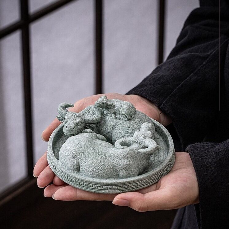青砂石を使用して手作りされた精巧な作品です。牛は、古代から東洋文化において豊穣、勤勉、そして繁栄を象徴する動物として信じられています。特に、親牛と子牛のペアは「家族の繁栄」や「長寿」を意味し、家族やビジネスの成長、発展を祈る象徴として多くの人々に信仰されています。