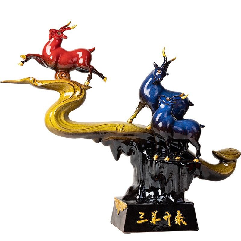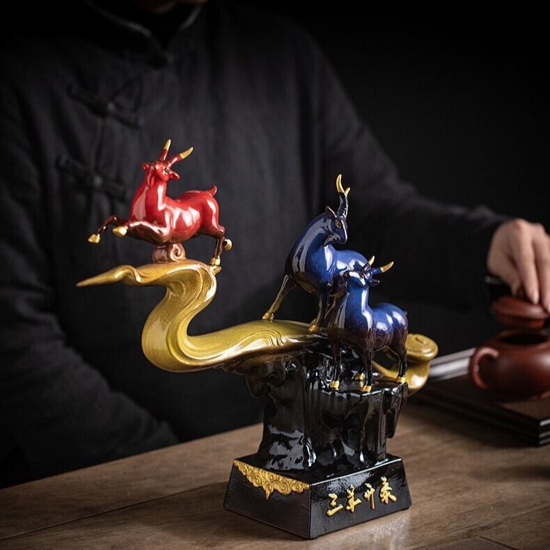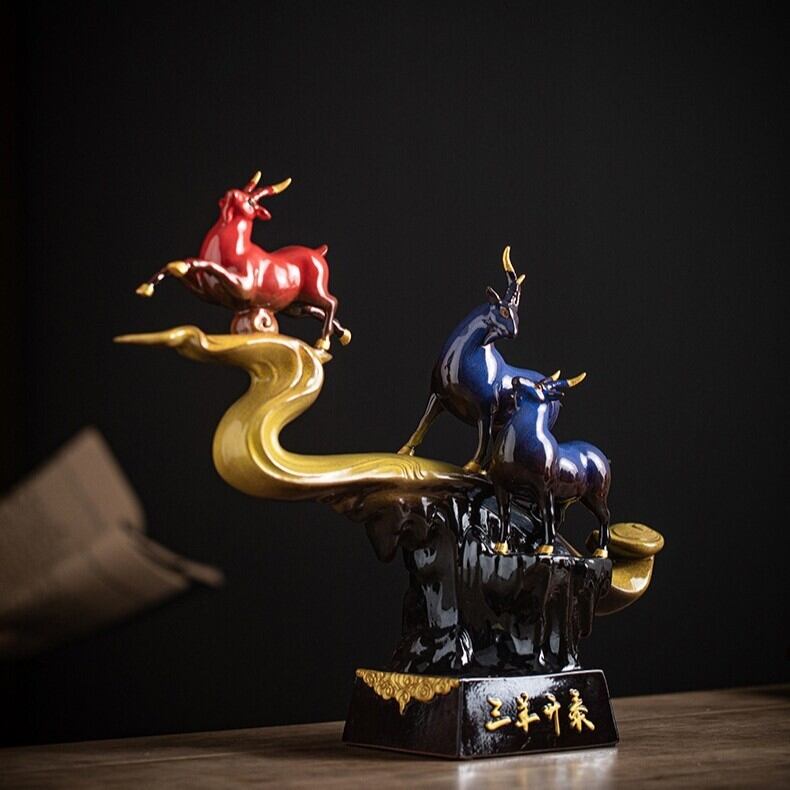 赤と青の色合いは、風水においてそれぞれ異なるエネルギーを持っています。赤は「情熱」「活力」「成功」を意味し、青は「知恵」「安定」「冷静さ」を象徴します。このオブジェでは、3匹の山羊が赤と青の色で表現されており、二つのエネルギーがバランスよく交わることで、家庭や仕事の安定と成長を促進すると信じられています。