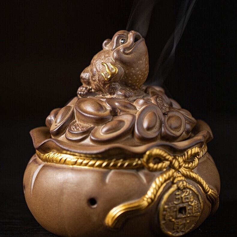 この香炉のデザインでは、蓋の上に蛙がのっており、蛙が香炉に宿ることで、家庭やビジネス、さらには個人の運気を整えるとされます。香炉としての実用性を持ちながら、蛙がもたらすとされるポジティブなエネルギーを空間に浸透させるアイテムです。また、香りとともに心を落ち着け、空間に穏やかな雰囲気をもたらすため、リラックスしたいときや集中したいときにも最適です。