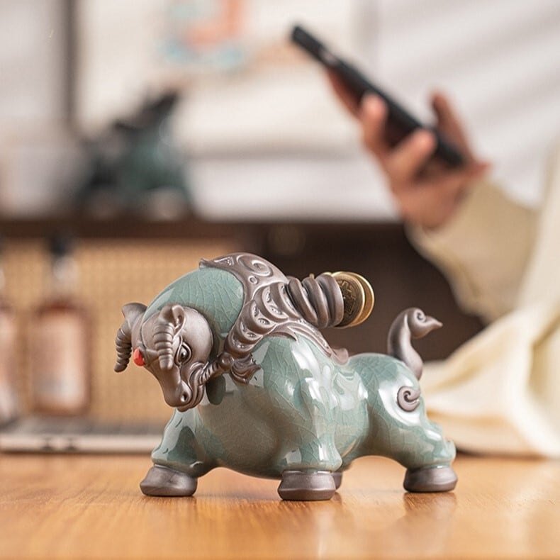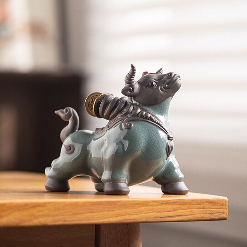この置物は、セラミックで精巧に作られ、2種類のデザインが用意されています。どちらも牛の力強さや温かみを感じさせる作りで、インテリアとしてもその存在感が光ります。特に「安定」「繁栄」を願う空間にぴったりで、飾ることで穏やかなエネルギーが流れ、日々の暮らしにポジティブな影響を与えてくれるかもしれません。