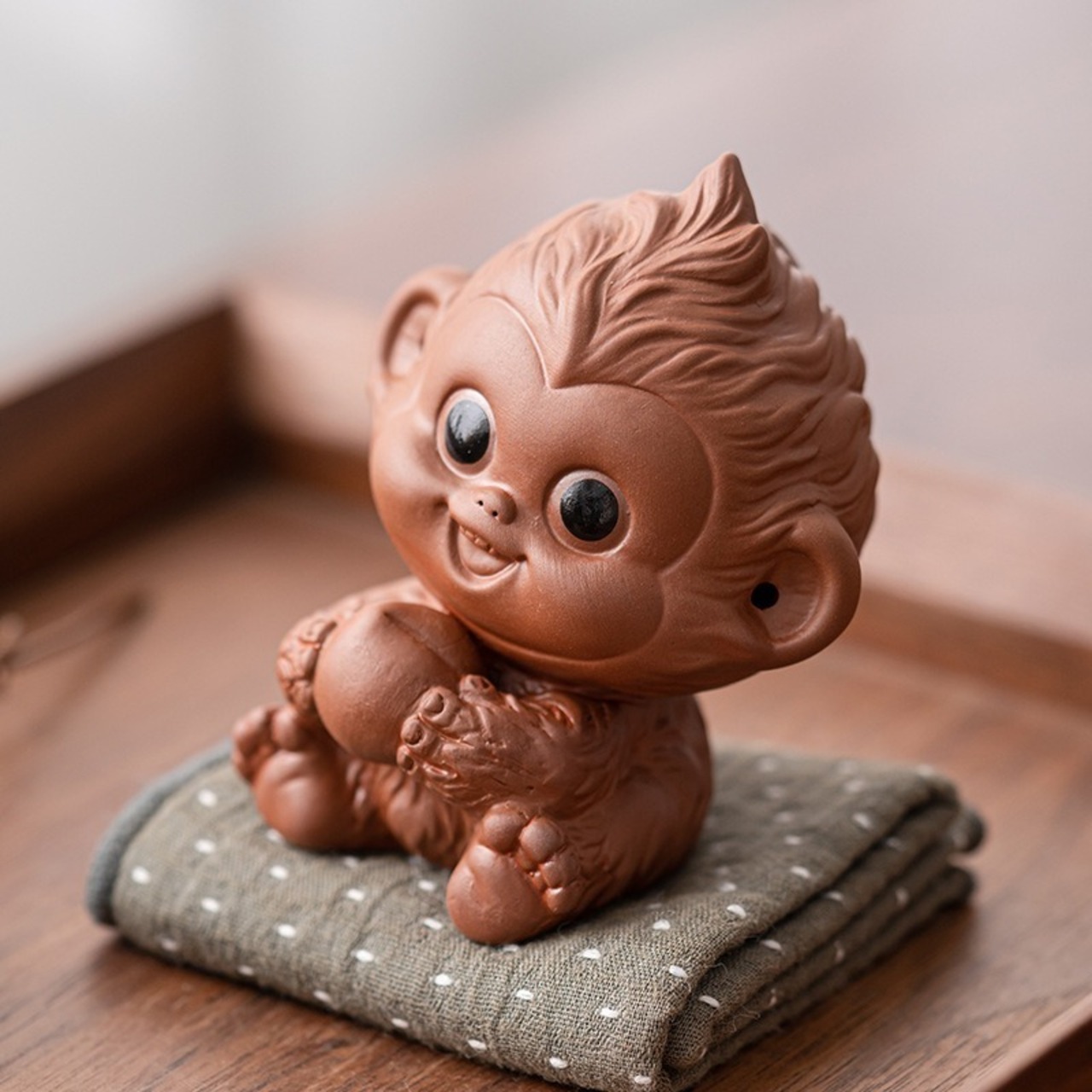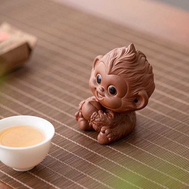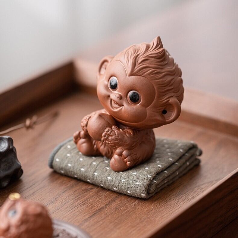 紫砂で作られたこの猿の置物は、洗練されたデザインとともに、落ち着いた空気を空間に漂わせ、見る人を和ませます。そのため、インテリアとしても非常に高い価値を持つだけでなく、風水の力を借りて、日常の運気向上にも貢献するかもしれません。