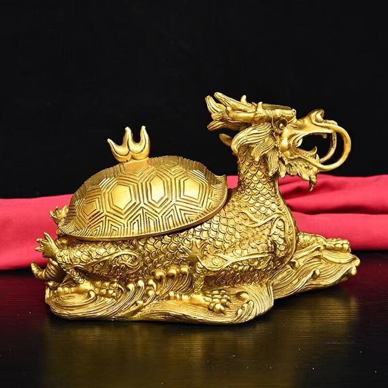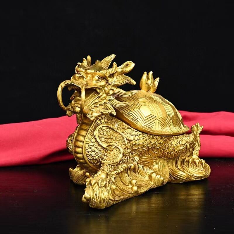この置物は、銅製で豪華に仕上げられたゴールドカラーが、見る者に強い印象を与え、インテリアとしても非常に魅力的です。風水では、金色は繁栄や富を象徴し、金運を呼び込む力があるとされています。龍亀の背中に乗る元宝(財宝)のモチーフは、財運が増えることを示し、ビジネスや投資などの成功を願う方々にとって特に縁起が良いとされています。