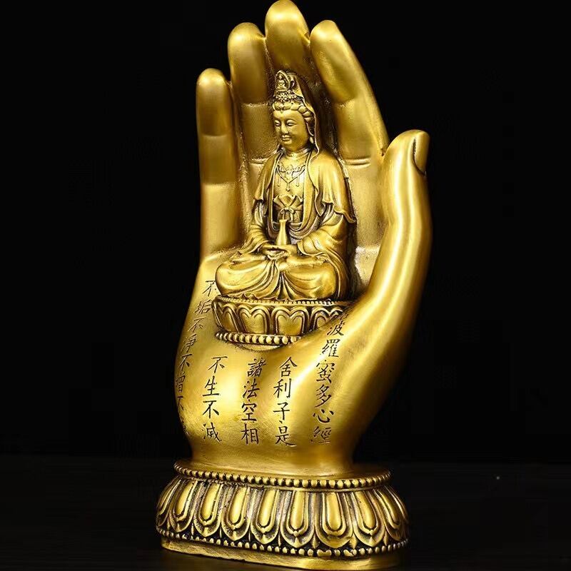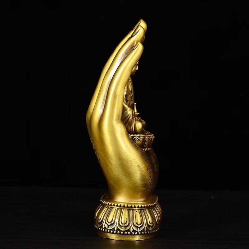 深い精神的な意味を持つ美しい置物です。観音菩薩は、慈悲と慈愛の象徴として広く信仰され、多くの人々の心の平安をもたらしてきました。特に、観音菩薩は「救済の神」として、苦しみや悩みを和らげ、幸福をもたらすと信じられています。この観音菩薩の姿が、神の手に座っているデザインは、宇宙の調和と神聖な力を象徴し、あなたを守護し、導く存在となるとされています。