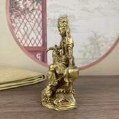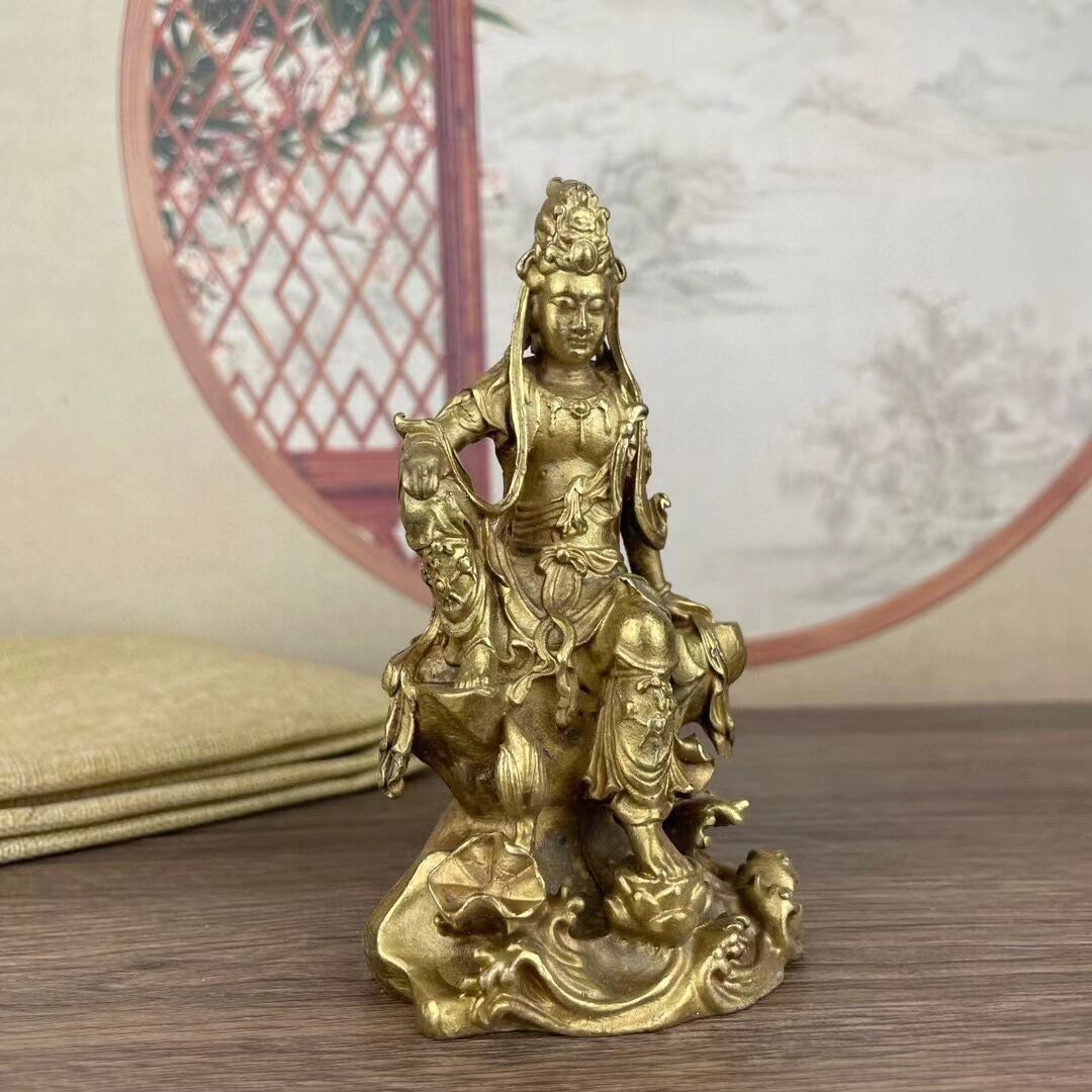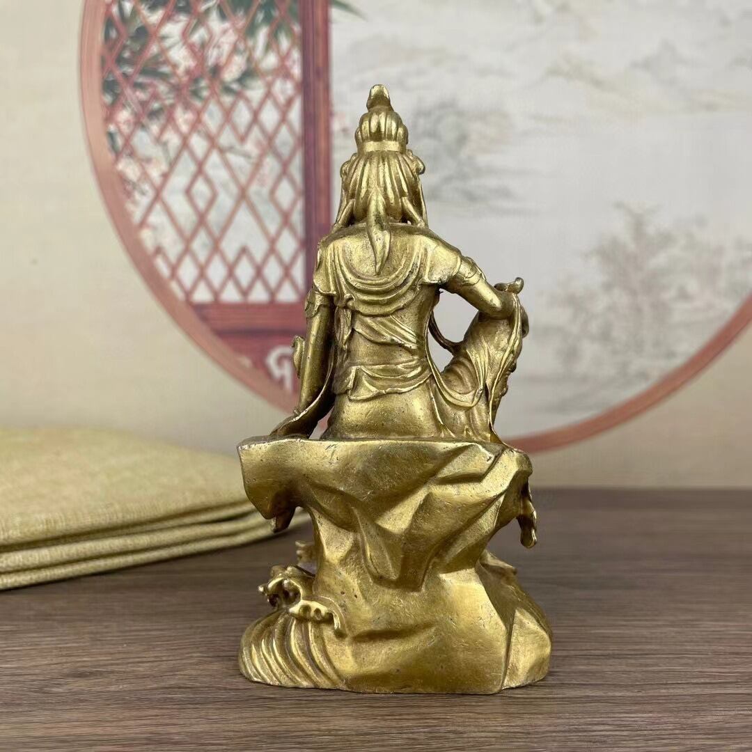 慈悲と智慧を象徴する仏教の守護神である観音菩薩をかたどった、美しい銅製の置物です。観音菩薩は、無限の慈悲の力を持ち、人々の苦しみを和らげ、困難を乗り越える力を与えると信じられています。特に、観音菩薩は「観音力」として多くの信仰を集め、願いが届くとされる存在です。この金色の観音菩薩像は、その優れたデザインと細部まで精緻に作られた仕上がりが特徴です。
