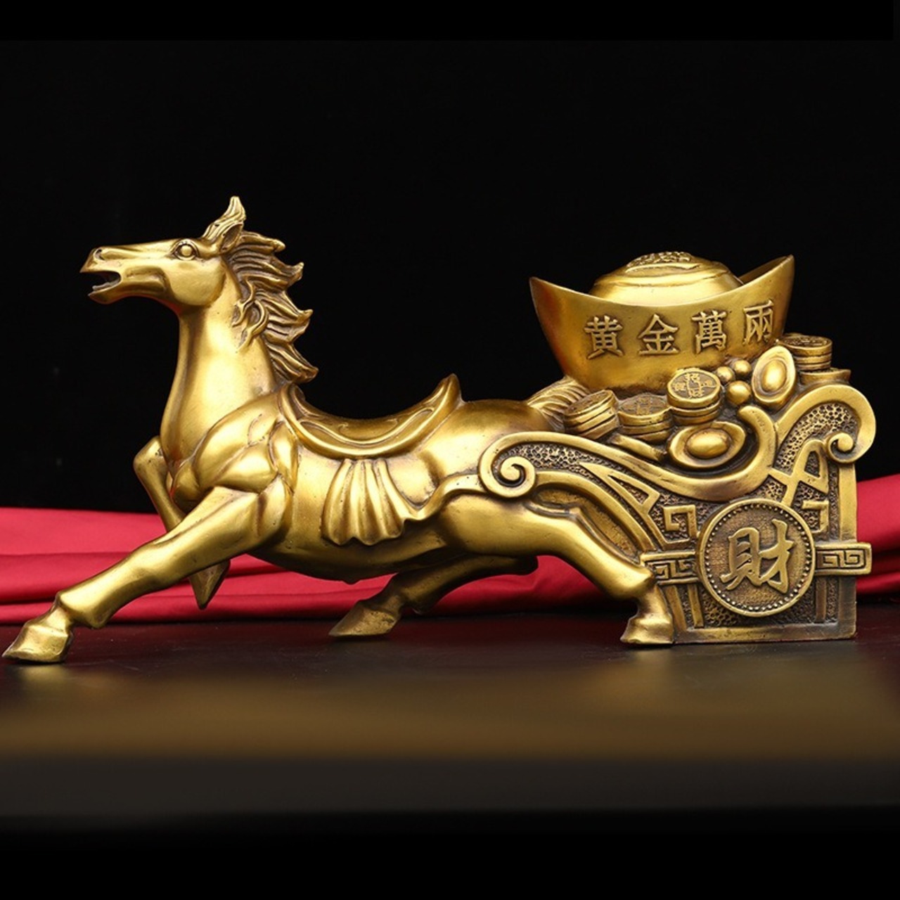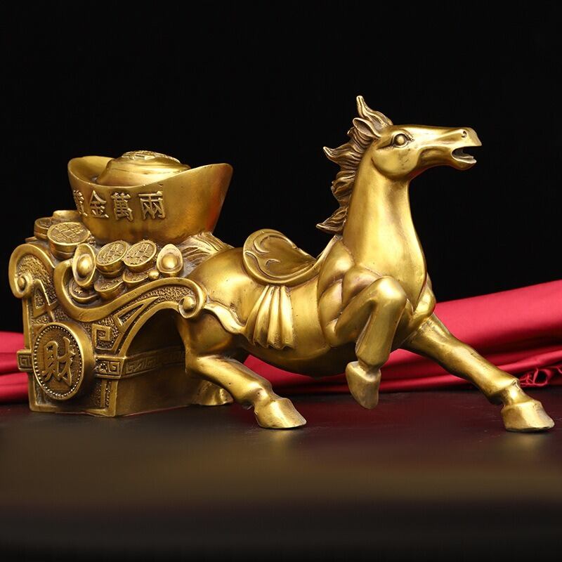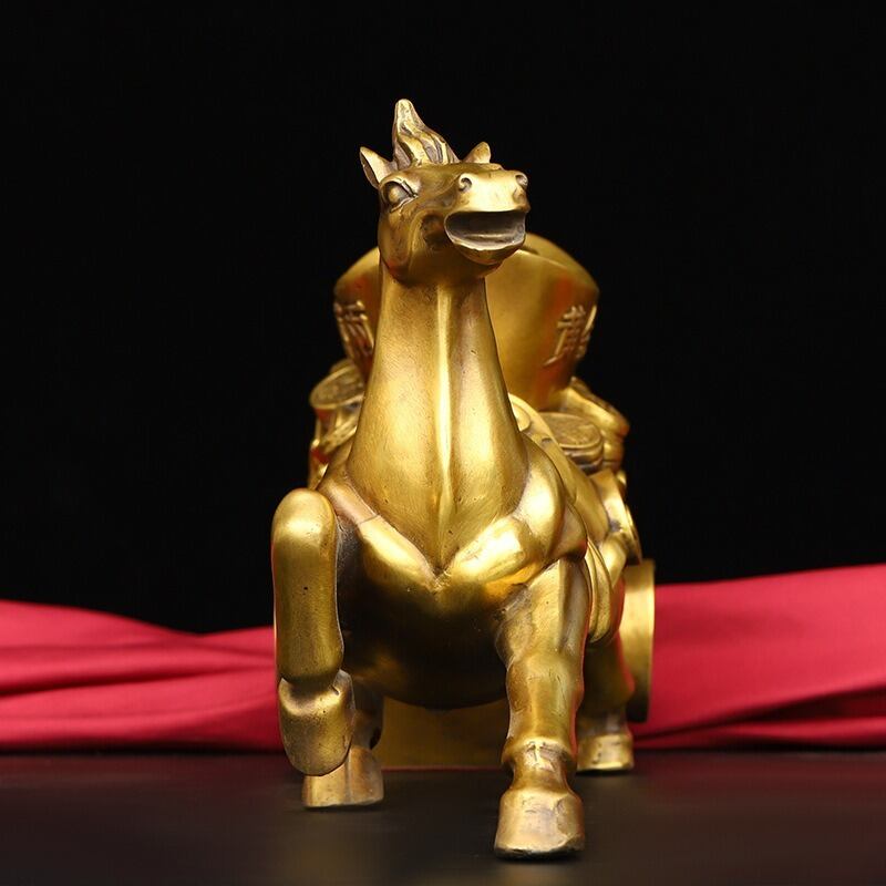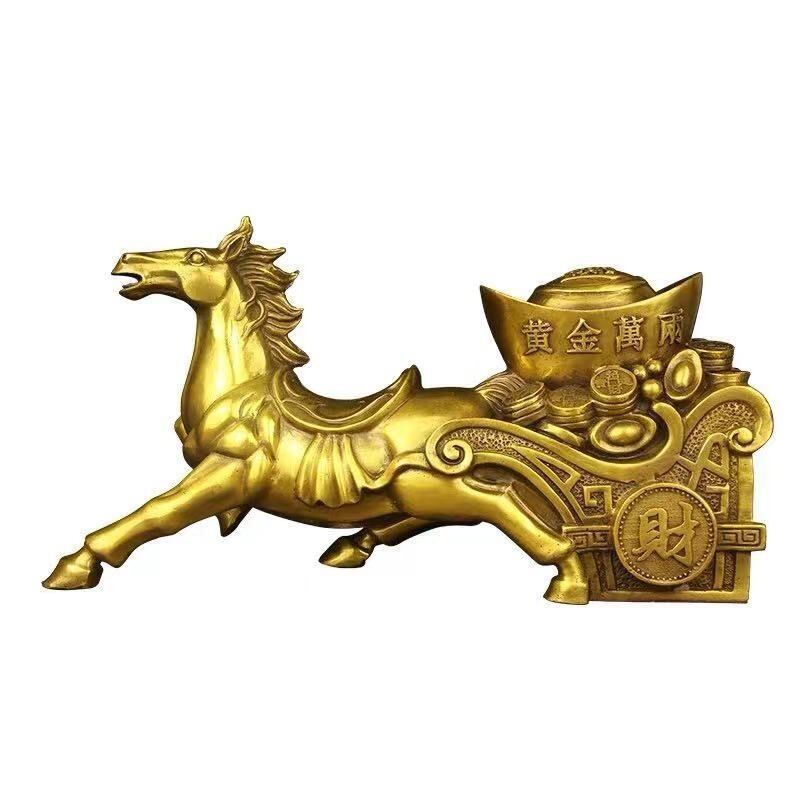 繁栄と財運を象徴する非常に縁起の良いアイテムです。中国の風水において、馬は「成功」と「進展」を象徴し、元宝(お金の形をした金塊)は「富と繁栄」を呼び込むと信じられています。この置物は、馬が元宝を力強く引っ張っている姿を表現しており、成功を引き寄せ、金運を高めるエネルギーを持つとされています。
