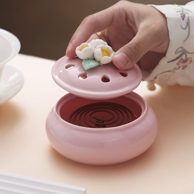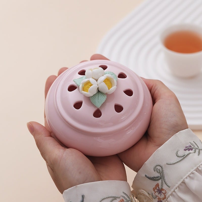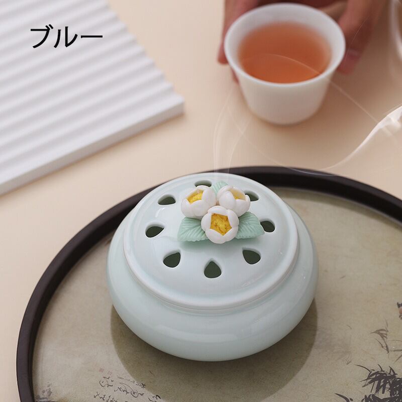香炉としてのお役目はもちろん、見た目にも美しいこのアイテムは、インテリアとしても最適です。風水では、花は繁栄や愛情を象徴し、特に白い花は清浄と幸運を引き寄せる力があるとされています。蓋に施された白い花が、空間に安らぎと調和をもたらし、家やオフィスで使うことで、リラックスした気持ちを促し、心の平穏を保つ助けとなるでしょう。