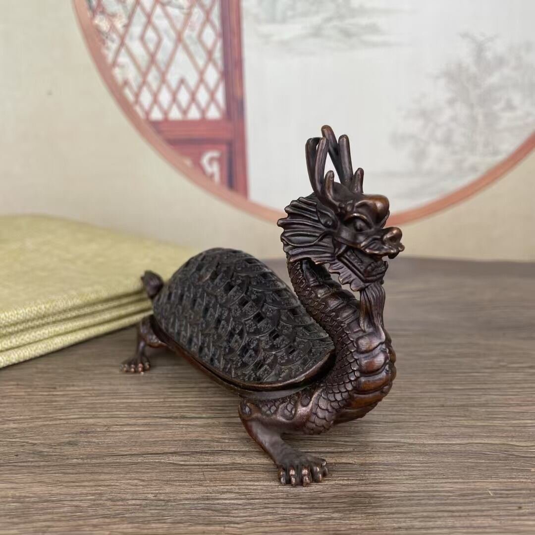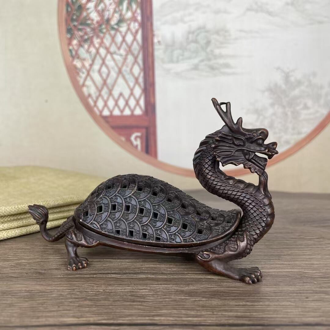 さらに、この香炉のデザインは、精巧な彫刻が施された銅の表面に美しく輝き、どのような場所に置いても高級感と神聖さを演出します。自宅やオフィスに飾ることで、空間全体が一層引き立つことでしょう。龍亀の守護力と香のエネルギーが相まって、日常生活に穏やかで安心感のある雰囲気を与え、運気を引き寄せる手助けとなるかもしれません。