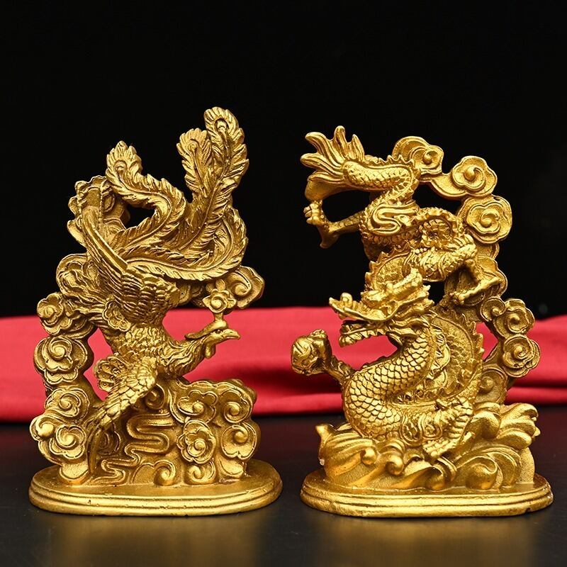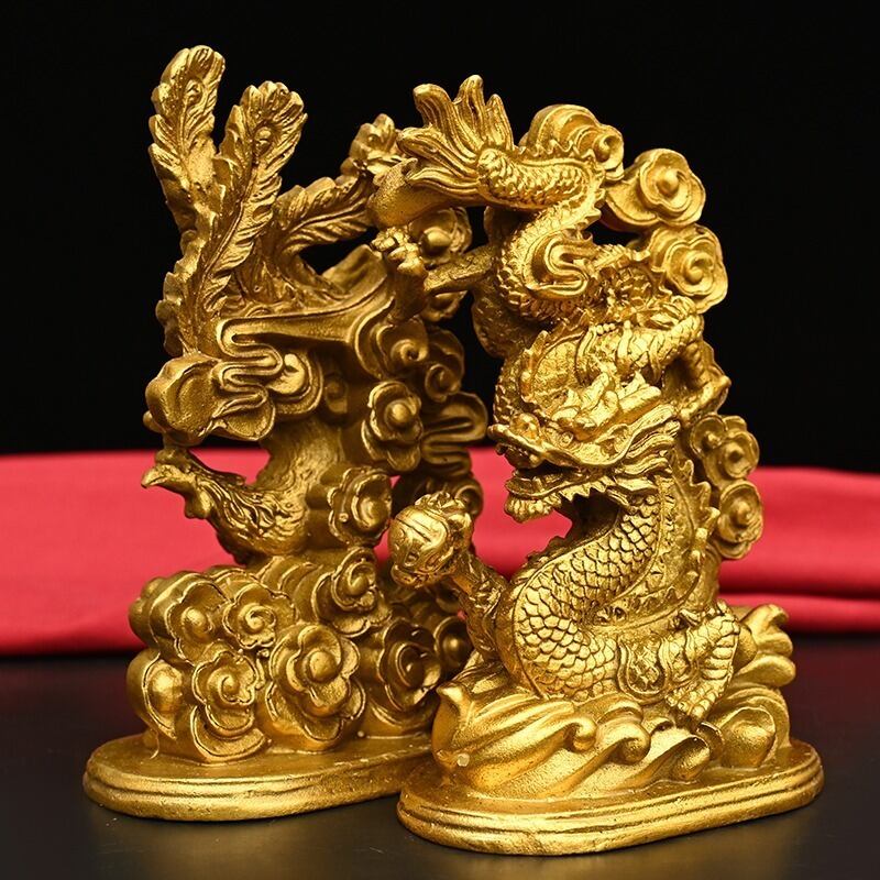 風水において、龍と鳳凰が一緒に配置されることで、「調和」と「繁栄」が生まれると信じられています。龍は積極的なエネルギーを、鳳凰は調和と平穏をもたらし、二者が共に存在することで、家やオフィスの運気が安定し、繁栄を引き寄せるとされています。また、金色は富と繁栄を象徴する色であり、金色の龍と鳳凰はさらにその力を高めるとされています。