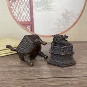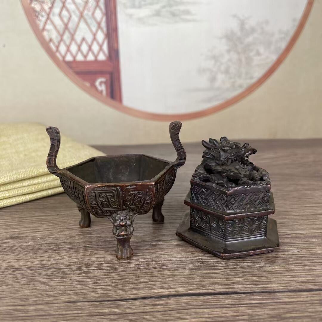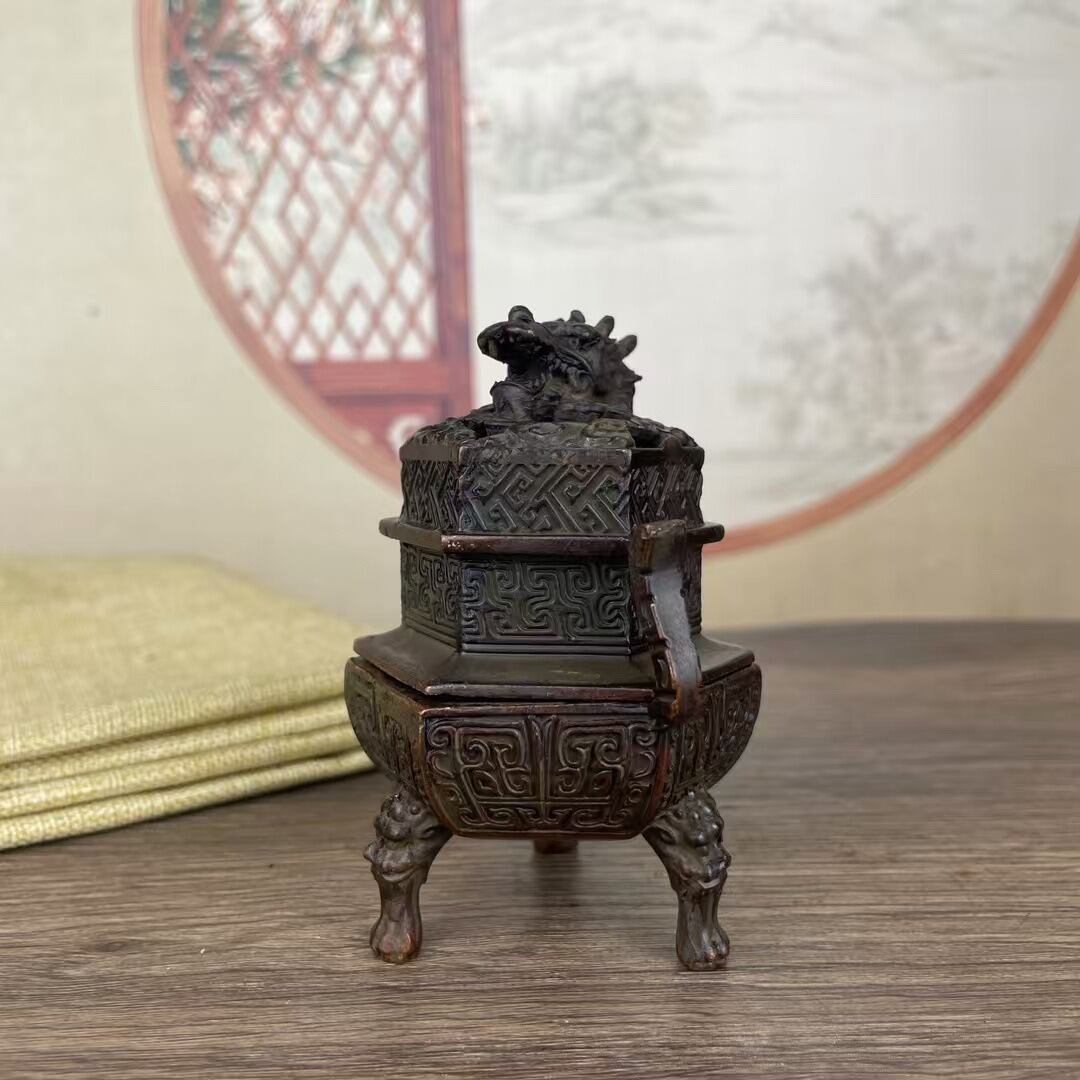 伝統的な香炉に豪華なデザインが施された、非常に価値あるアイテムです。銅製で作られたこの香炉の蓋には、力強いドラゴンの顔があしらわれており、その精緻な彫刻は一目で目を引きます。ドラゴンは古来より「力」「繁栄」「守護」を象徴し、風水やスピリチュアルな信仰においては強い守護神として広く信じられています。