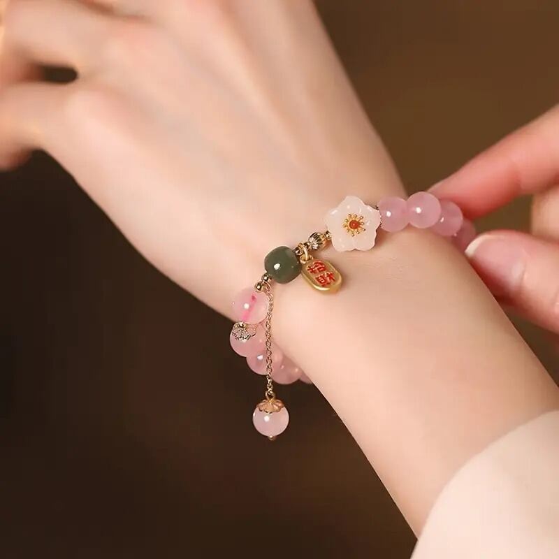 桜の花が持つ力強さと優しさは、心を癒し、日々のストレスを和らげてくれるでしょう。ピンクのビーズは愛情や優しさ、そして人間関係を深めるとされる色で、特に恋愛や家族との絆を強めるために信じられています。心温まるエネルギーを放つこのブレスレットは、大切な人への贈り物にも最適です。