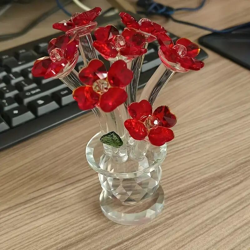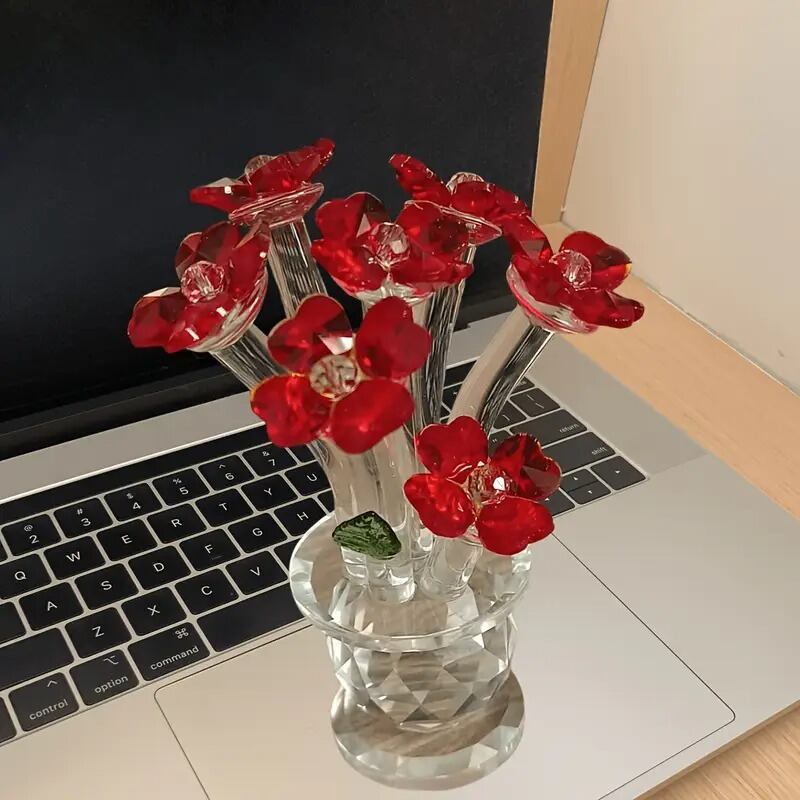 風水において、赤はエネルギーや活力を象徴する色であり、この赤い花の置物は、空間にポジティブなエネルギーをもたらすと考えられています。また、クリスタルの輝きが光を反射し、まるで周囲のエネルギーを清浄化するかのように、運気を向上させるとも言われています。
