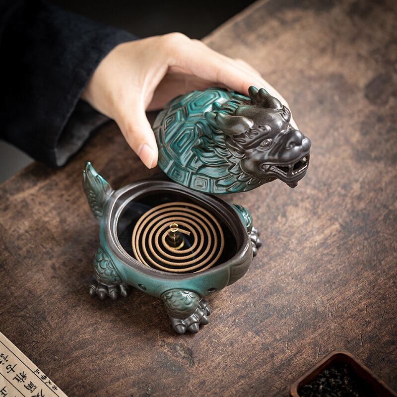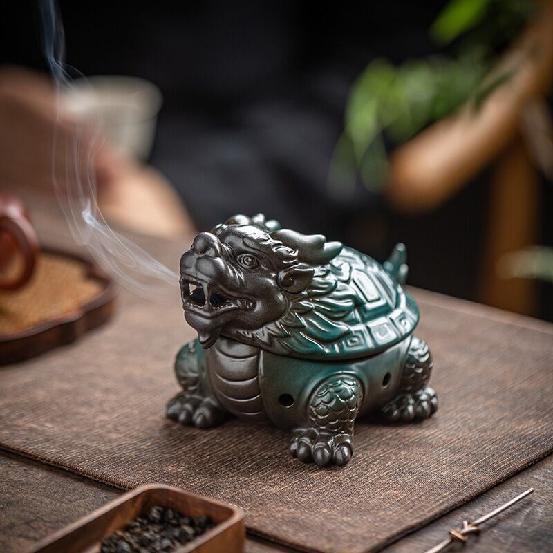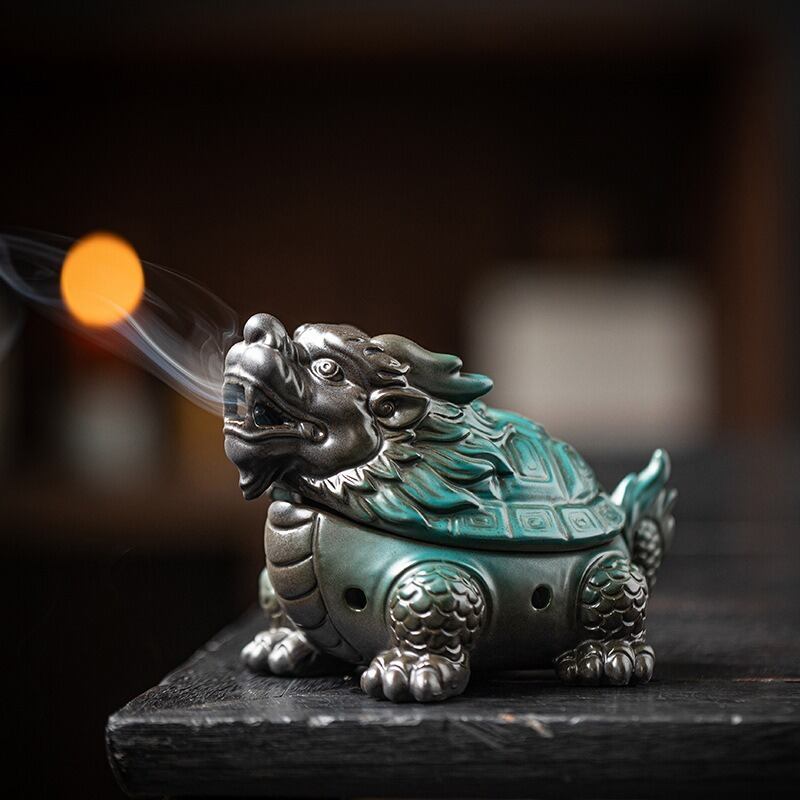 風水やスピリチュアルの世界で長い間、運気を高める象徴として信じられている「龍」と「亀」の組み合わせを描いた香炉です。この龍亀は、龍が天から降り、亀が大地に足をつけて支える姿が特徴的で、天と地、そして陰陽のバランスを象徴しています。龍は力強さや繁栄を、亀は安定や長寿を象徴するため、この香炉は両方のエネルギーを兼ね備え、運気や家庭の安定、金運、繁栄を呼び込むと信じられています。