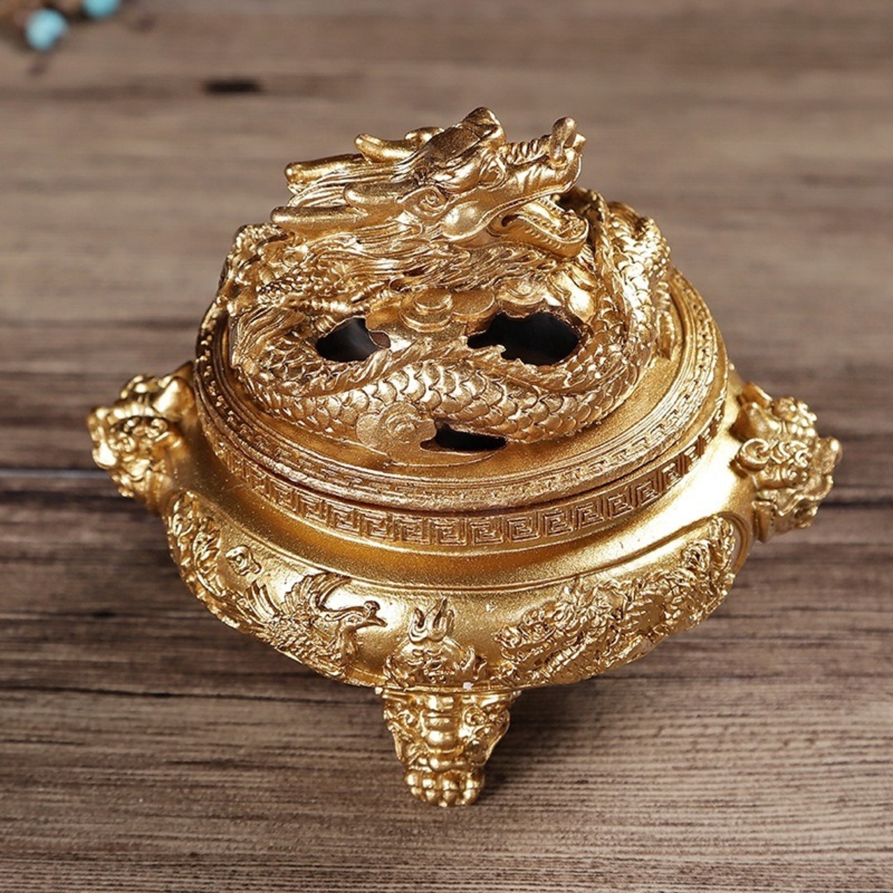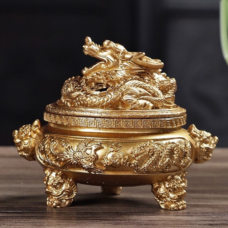 この香炉は、ドラゴンの力強さと、ゴールドの輝きが融合した美しい作品です。ゴールドは、金運や繁栄、成功を呼び寄せるカラーとして、特にビジネスや家庭の繁栄を願う方々に好まれています。三脚付きのデザインは、香を焚くためだけでなく、空間のエネルギーを高めるための重要なアイテムとなり、日々の生活に癒しと活力を与えてくれるでしょう。
