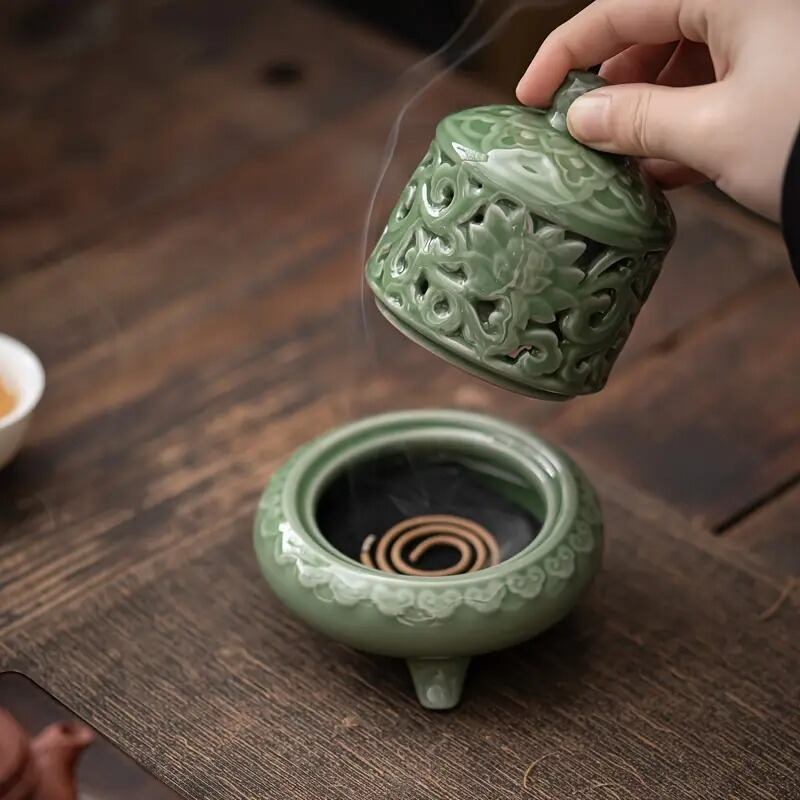 深い緑色のセラミック製で、美しい花のモチーフが施された洗練されたデザインが特徴です。香炉は、古来より香りを焚くことで空間を浄化し、精神を落ち着けるための重要なアイテムとされています。特に風水では、香りがもたらすエネルギーの変化が強調され、悪い運気を払拭し、良い運気を引き寄せる助けとなると信じられています。
