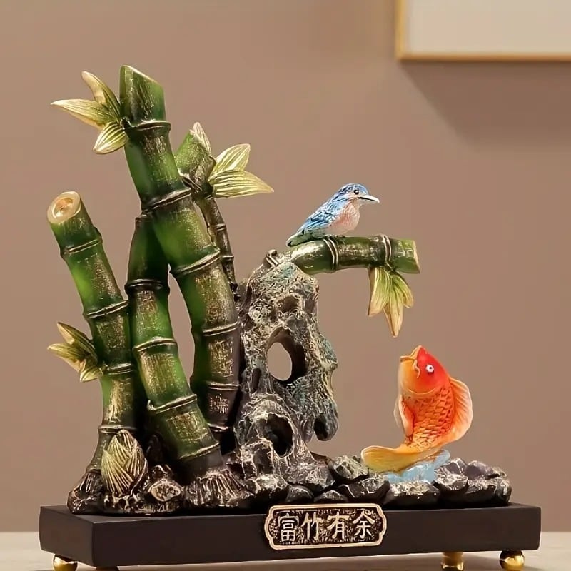 これらのモチーフが融合したこの置物は、繁栄を求める方々にとって、非常に縁起の良いアイテムです。竹林の中で鯉が泳ぎ、鳥が飛ぶ姿が描かれることで、穏やかなエネルギーとともに、日々の生活に良い運気をもたらすと言われています。特に、事業の成功や家庭の調和を望む方には、心の平穏とともに新たなチャンスを呼び寄せるサポートになるかもしれません。