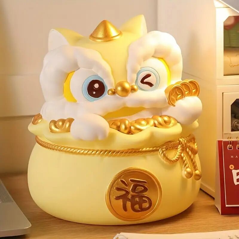 伝統的な獅子をモチーフにした可愛らしい貯金箱です。獅子は中国や日本をはじめとする多くの文化において、幸運や繁栄、守護のシンボルとして古くから親しまれてきました。その力強さと優雅さから、悪運や厄を払い、良い運を引き寄せると信じられています。