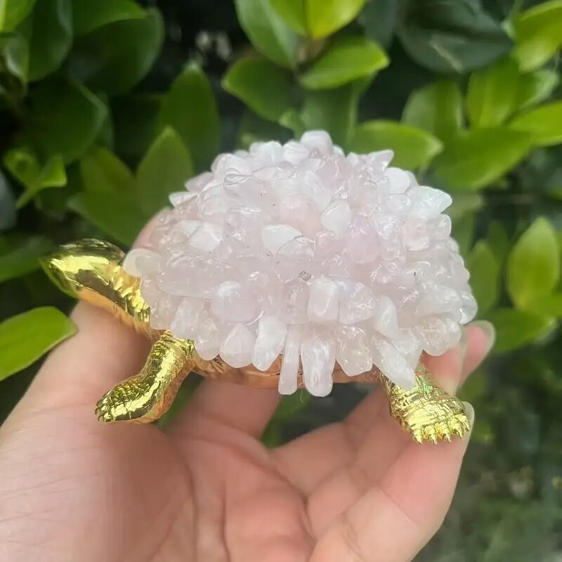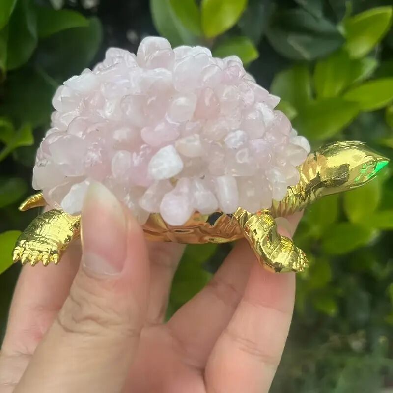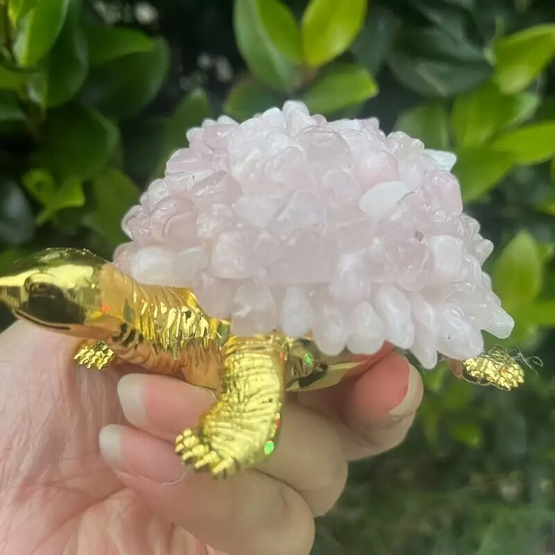 亀の背中にはローズクォーツがあしらわれており、この天然石は「愛と癒し」を象徴する石として知られています。ローズクォーツは、心のバランスを整え、ポジティブなエネルギーを引き寄せると信じられています。また、愛情や人間関係に良い影響を与えるとされており、家庭や仕事における調和を促進する存在としても重宝されています。