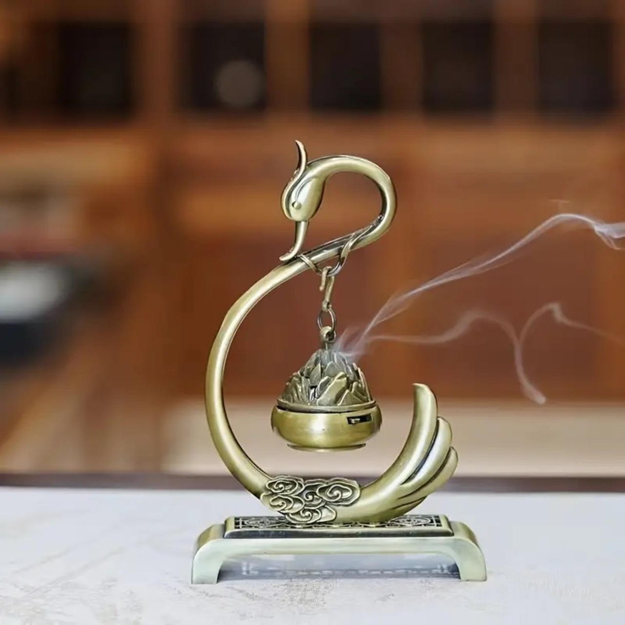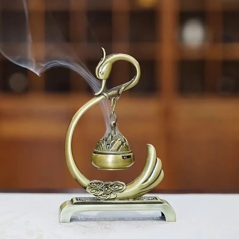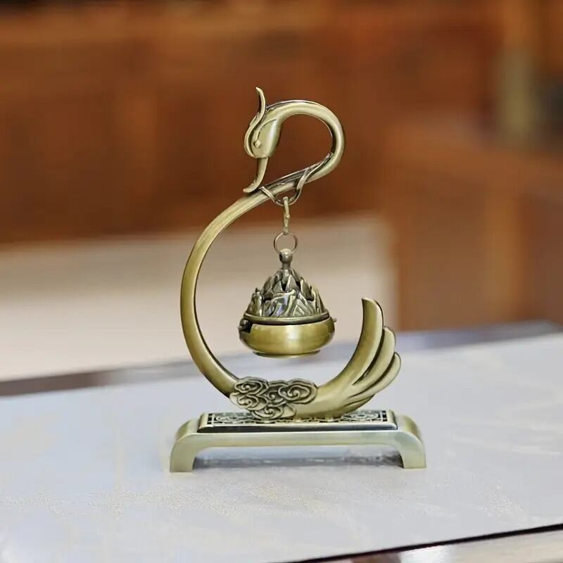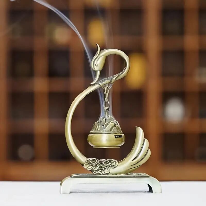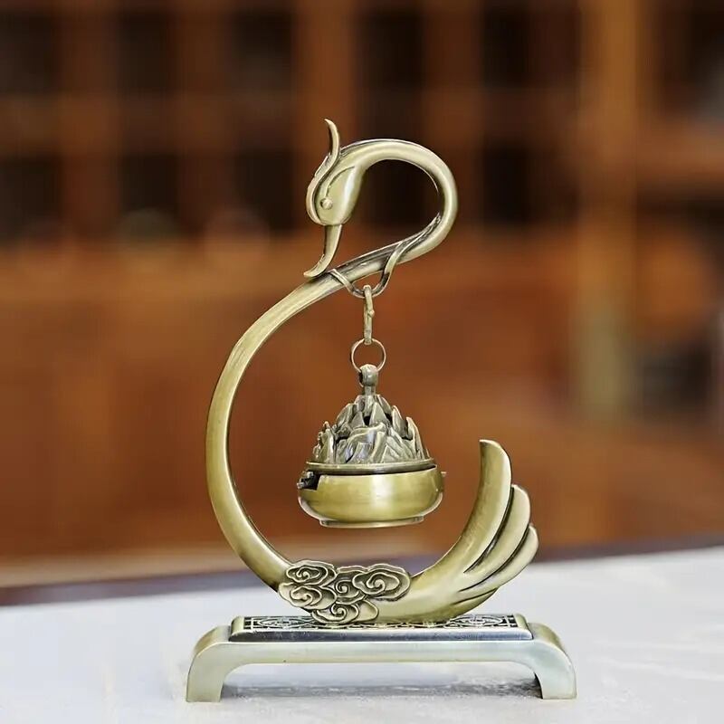 この香炉の中央に吊るされた香炉は、風水においても重要な役割を果たすアイテムです。香りは空間のエネルギーを浄化し、気の流れを整えると信じられています。特に、この香炉を使うことで、ストレスや疲れを解消し、心身のバランスを整える効果が期待されると言われています。香炉が持つ癒しの力と、白鳥が象徴する平和のエネルギーが調和し、あなたの生活空間に穏やかで心地よい空気をもたらすことでしょう。